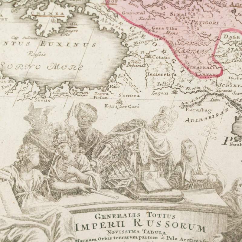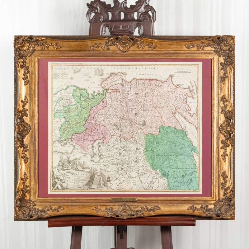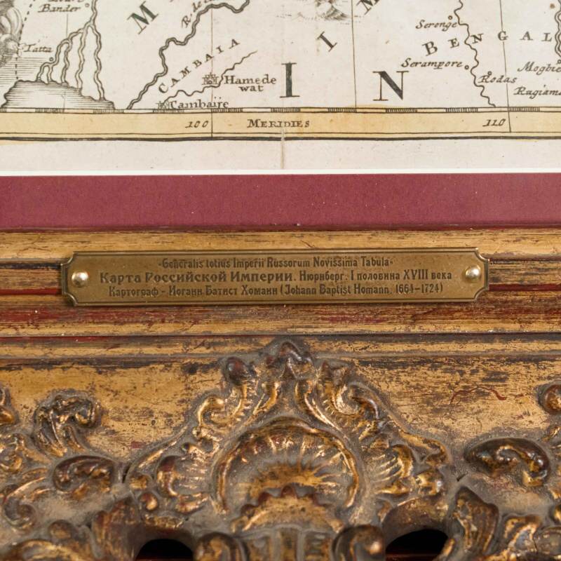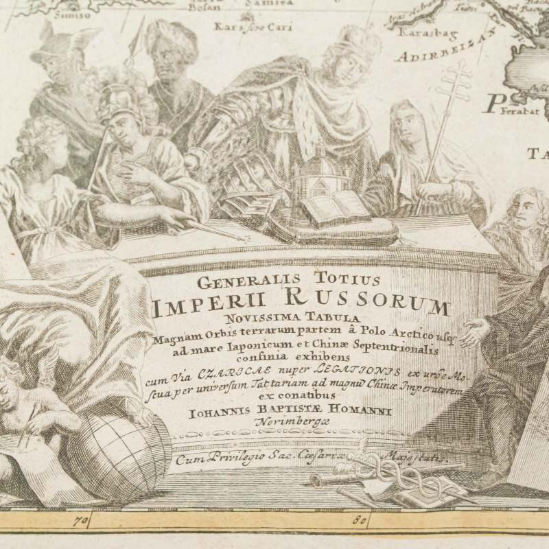 Сверху изображена фигура правителя – величественно восседающий мужчина в царских одеяниях с короной, слева от него — богиня Афина и Меркурий (символ торговли), справа от картуша расположена группа ученных – символизирующие науку, картографию и исследование мира. Карта «Generalis Totius Imperii Russorum Novissima Tabula» (Общая новейшая карта всей Российской Империи) выполнена в традиционном для своего времени богато украшенном стиле. Карта охватывает территории от Ливонии (совр. Латвия, Эстония, Литва) на западе до Камчатки на востоке; на юге идет от Грузии (не показанной как часть России) через Каспий и Узбекистан, включая Тибет, до Монголии и Китая.