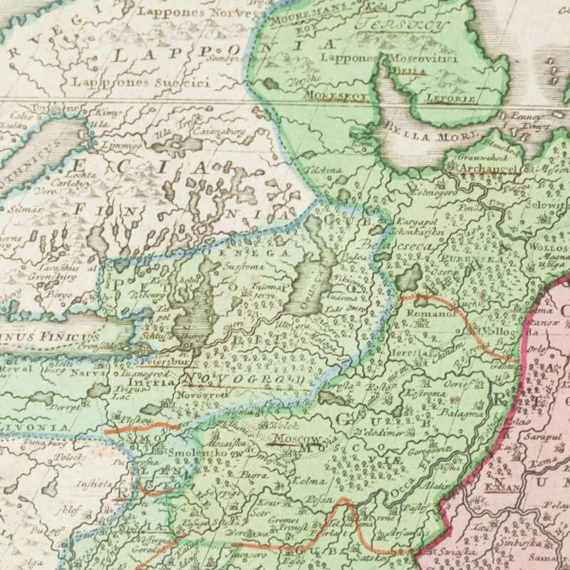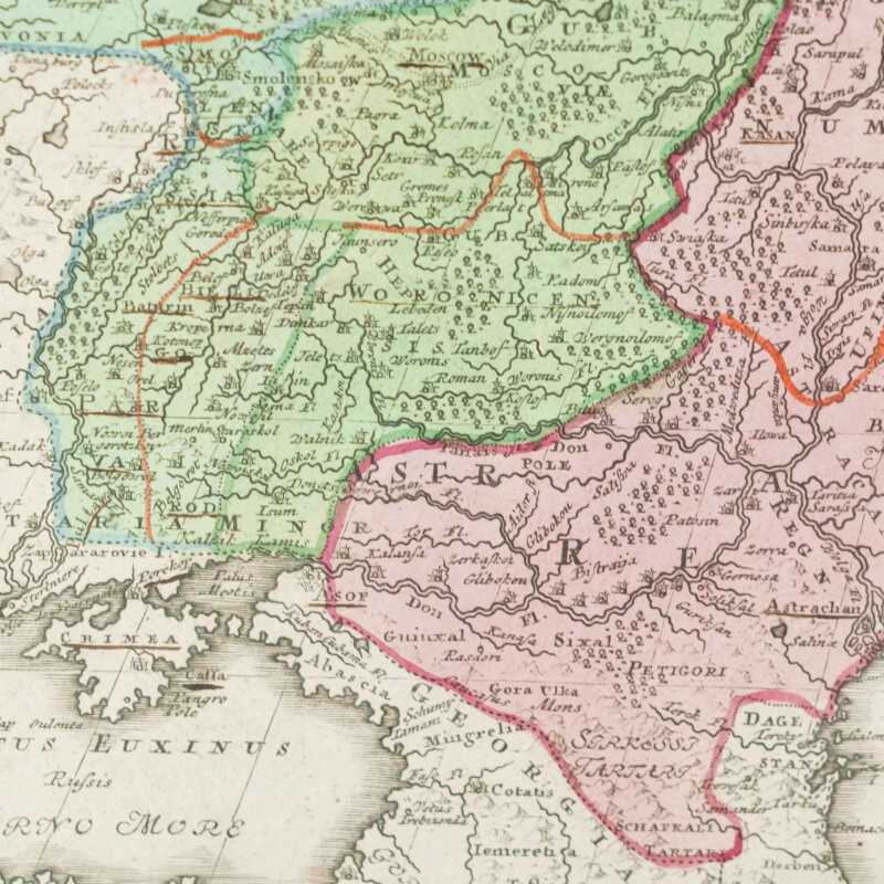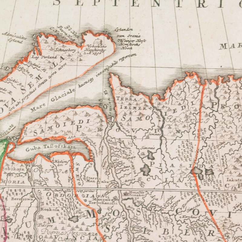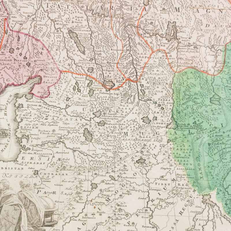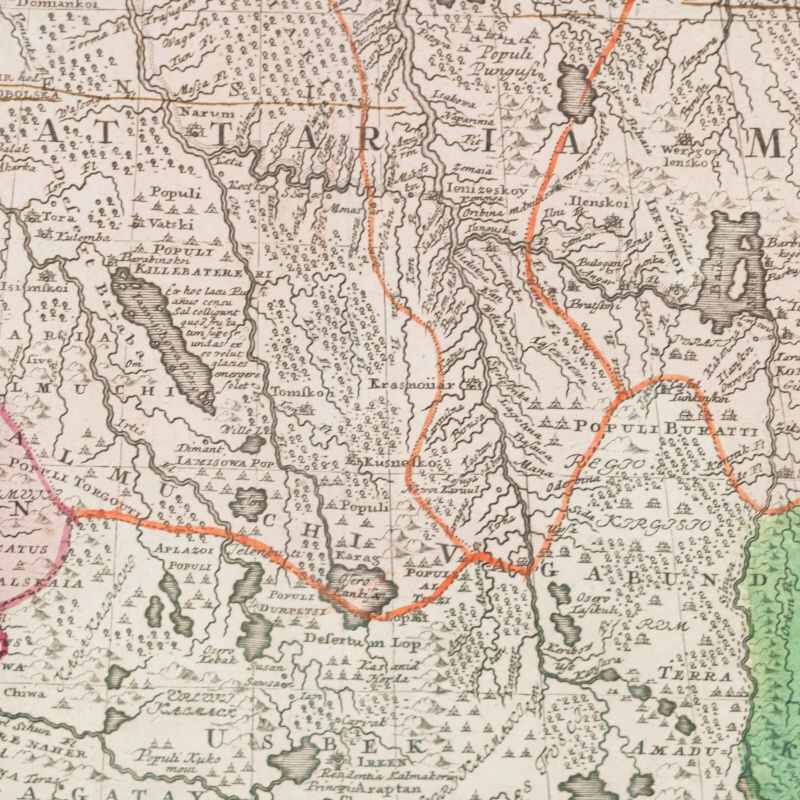 На ней изображены крупные города, такие как Москва, Санкт-Петербург, Казань, Тобольск, а также важные торговые пути и административные границы. Особый интерес для Казахстана представляет отмеченный на карте Каспийское море (Mare Caspium), Казахская Орда (Kassazier Orda, Kasafia Horda), озеро Зайсан (osero Susan), река Иртыш (Irtis), и другие регионы проживания казахского народа. Также важным моментом в изучении данной картографической науки касательно Средней Азии является обозначение Самарканда, Ташкента, Бухары, Хивы, также расселение среднеазиатских народов – туркменов, узбеков, каракалпаков.