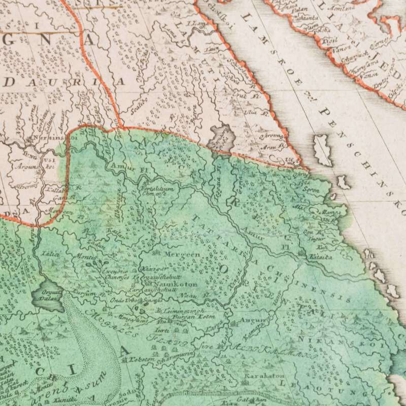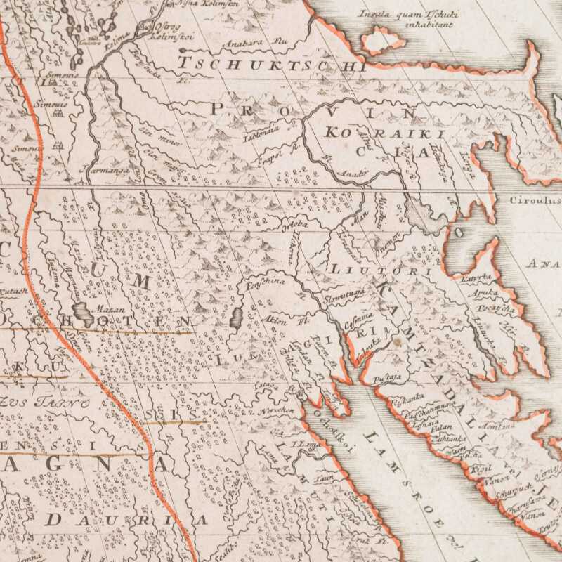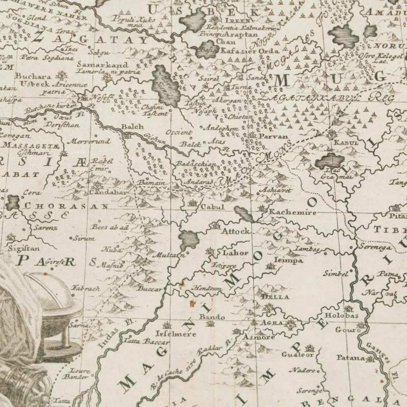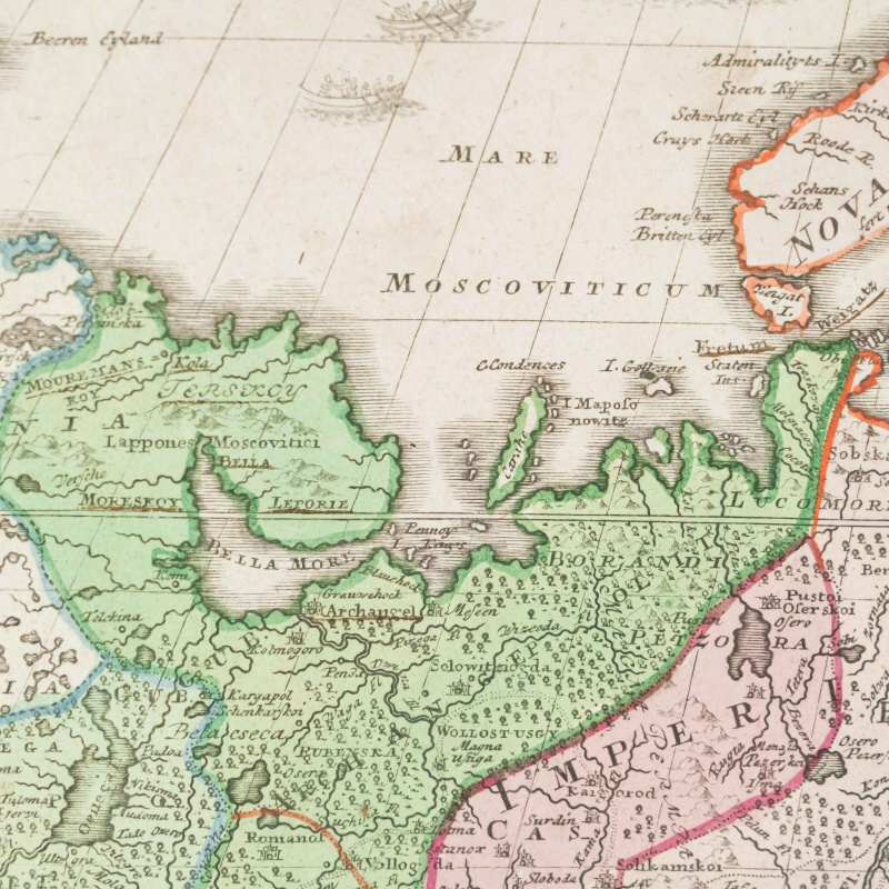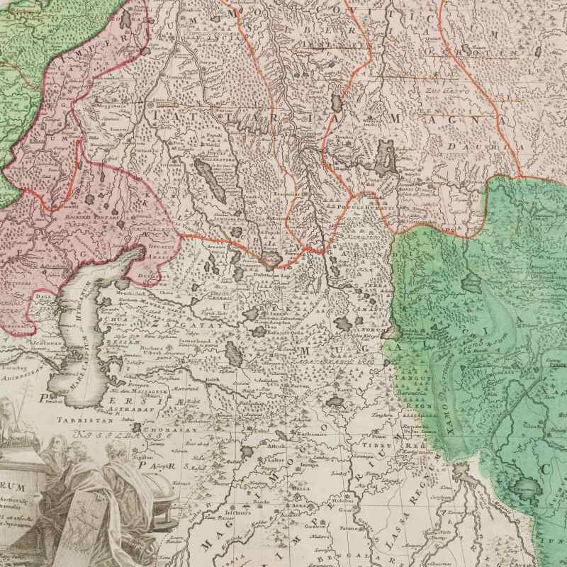 На ней изображены крупные города, такие как Москва, Санкт-Петербург, Казань, Тобольск, а также важные торговые пути и административные границы. Особый интерес для Казахстана представляет отмеченный на карте Каспийское море (Mare Caspium), Казахская Орда (Kassazier Orda, Kasafia Horda), озеро Зайсан (osero Susan), река Иртыш (Irtis), и другие регионы проживания казахского народа. Также важным моментом в изучении данной картографической науки касательно Средней Азии является обозначение Самарканда, Ташкента, Бухары, Хивы, также расселение среднеазиатских народов – туркменов, узбеков, каракалпаков.