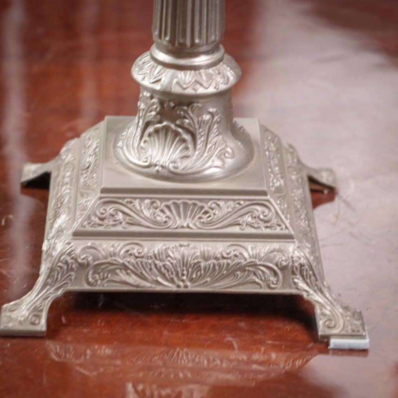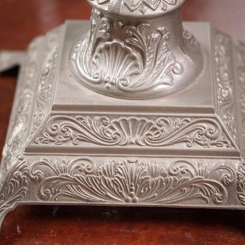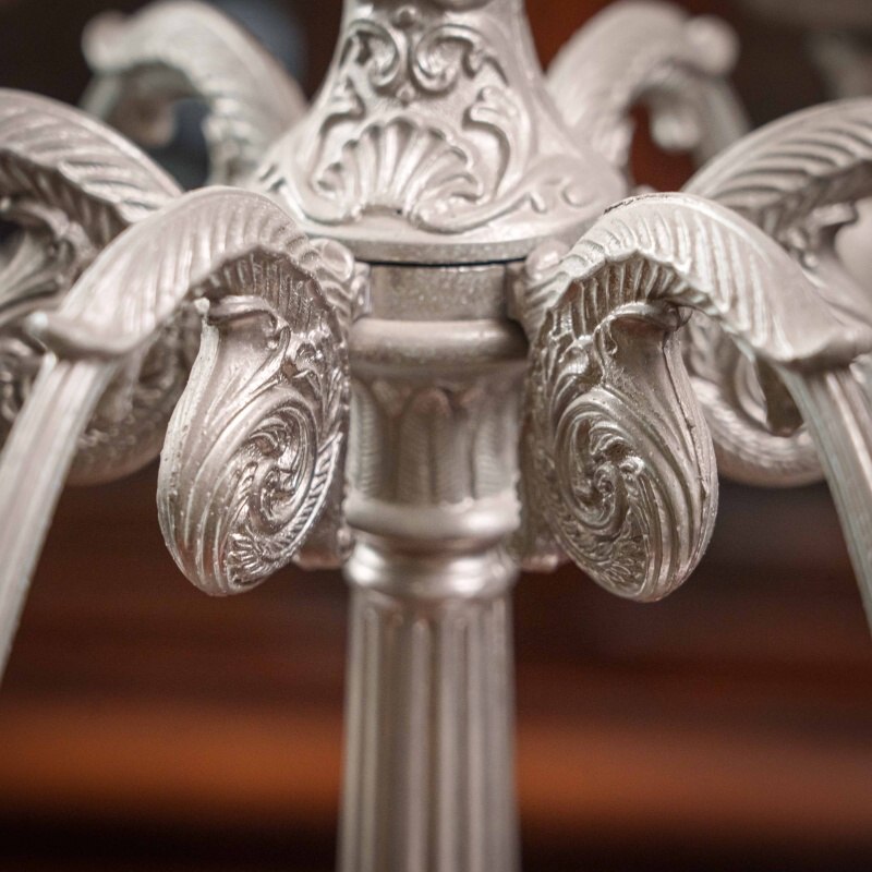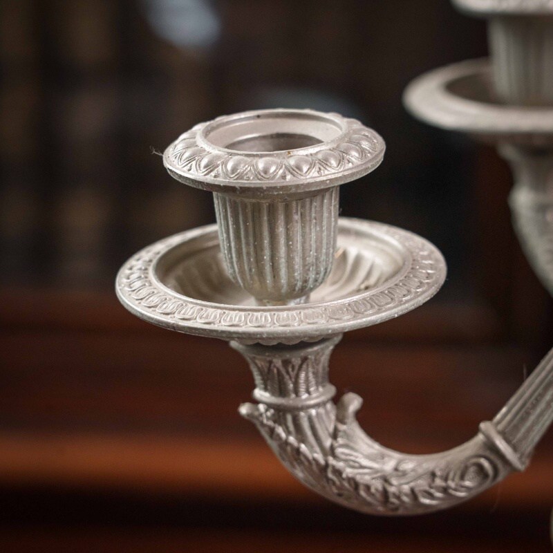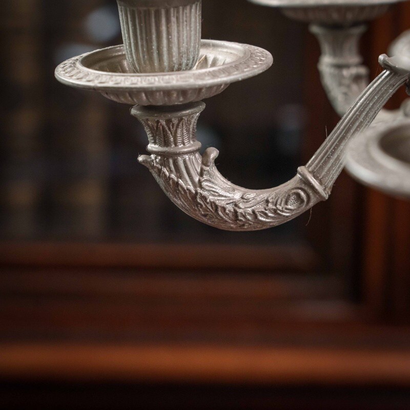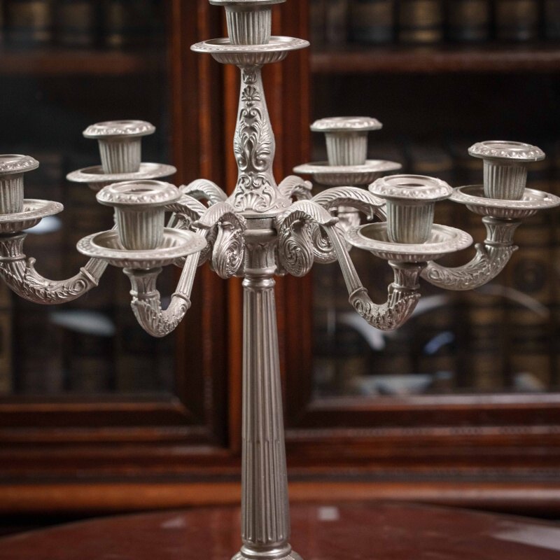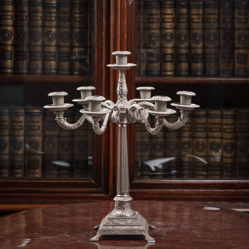 Канделябр из олова на 7 свечей, выполненный в XX веке. Антикварные подсвечники и канделябры прекрасно дополнят любой самый современный интерьер, придавая ему черты торжественности, строгости, благородства. За долгий период существования эти предметы стали классическим эталоном, необходимым для придания гостиной или кабинету особой торжественности, подчеркивая связь времен и преемственность поколений. Антикварные вещи, органично вписываясь в современную обстановку, способны придать ей нотку индивидуальности, а также подчеркнуть уникальность и неповторимый уют домашней атмосферы. Поэтому антикварные подсвечники и канделябры являются прекрасным подарком на любой праздник.