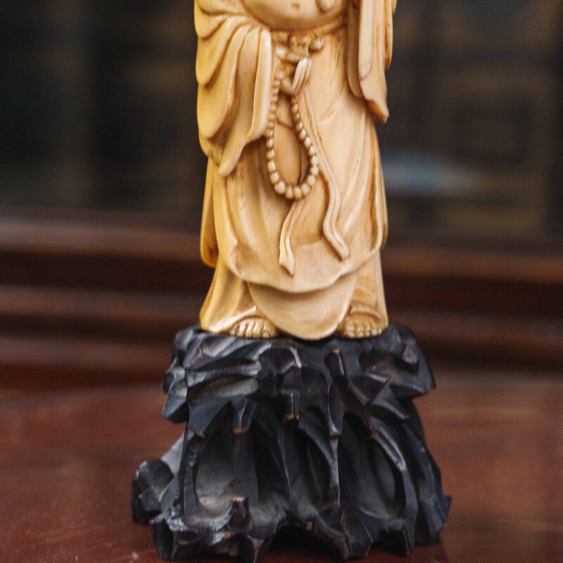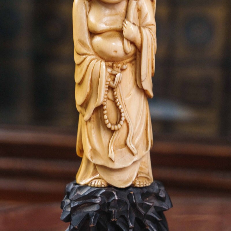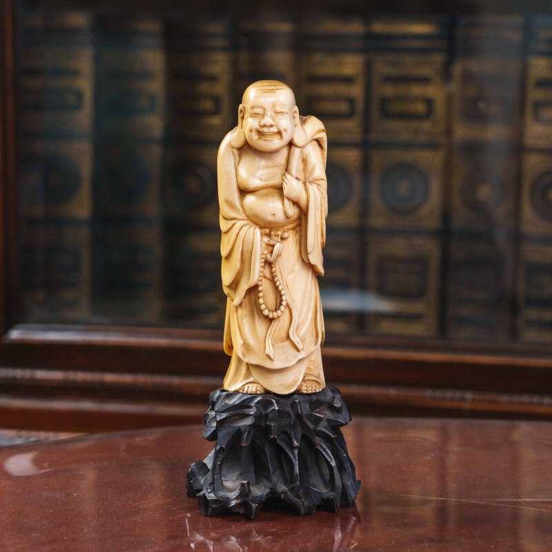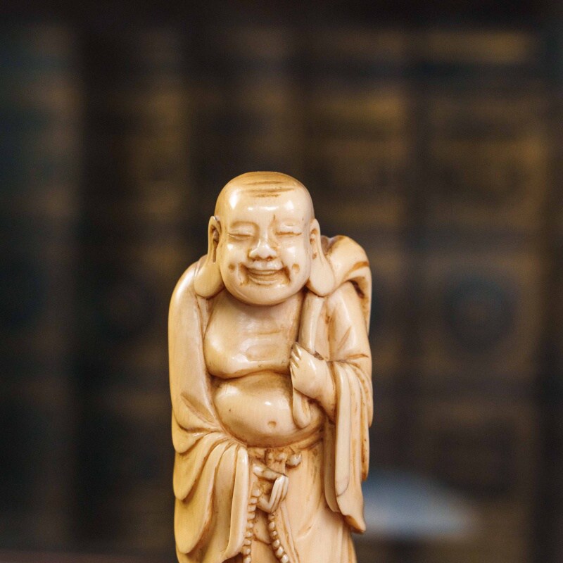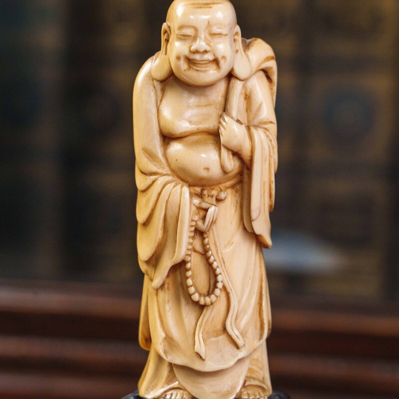 Окимоно Хотей, также известный как «Смеющийся Будда» или «Будда Изобилия», является одним из семи почитаемых божеств счастья в японской мифологии и богом счастья, богатства и благополучия. Считается, что Хотей, вечно довольный и беззаботный, избавляет от грусти, тоски, гнева и напряжения. Он также является символом богатства и процветания. Из его мешка святой извлекает блага, которых достоин каждый, кто следует предписаниям учения фэн-шуй. Также считается, что он способен исполнять заветные мечты. Хотей часто изображается как лысый, улыбающийся монах с большим животом, символизирующим великодушие и счастье. Один из самых популярных персонажей нэцкэ и окимоно.