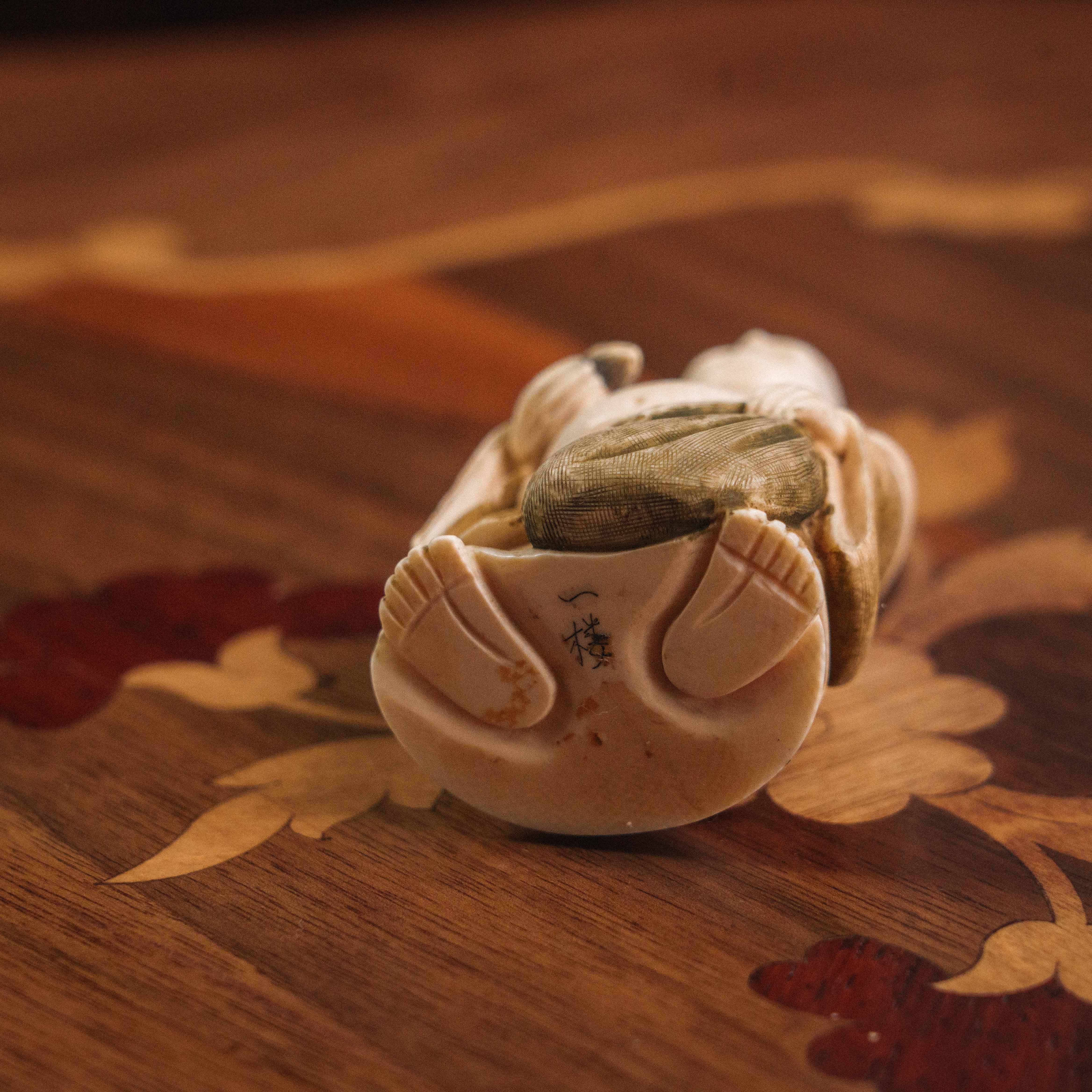 Фигурка выполнена в технике классической японской резьбы по слоновой кости — одном из самых утончённых и трудоёмких видов декоративно-прикладного искусства. Каждый изгиб, складка одежды и выражение лица проработаны с ювелирной точностью, что придаёт образу живость и характер.