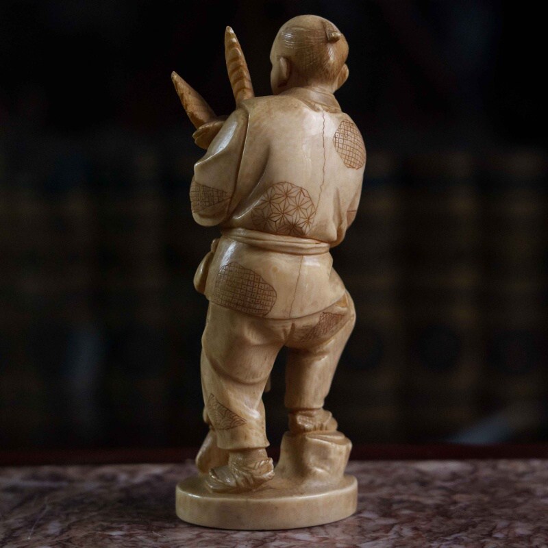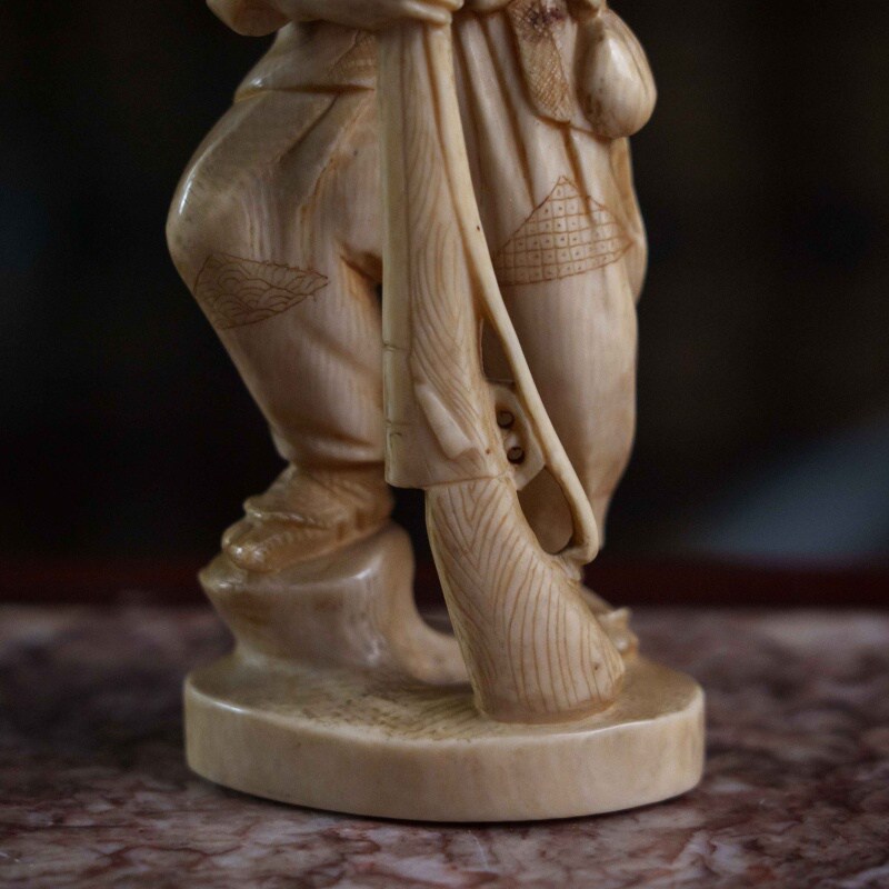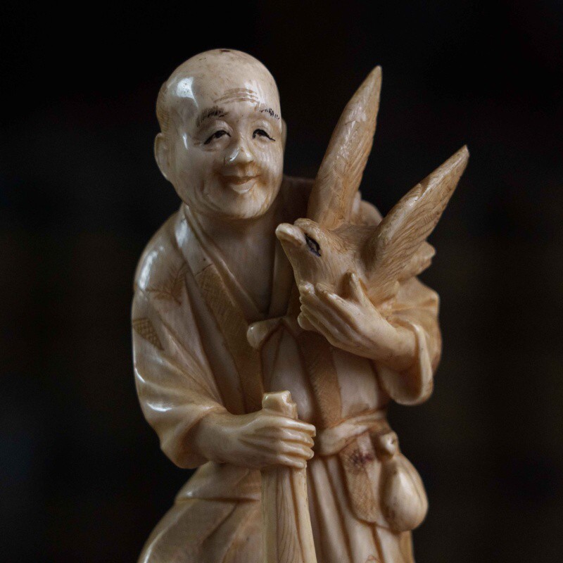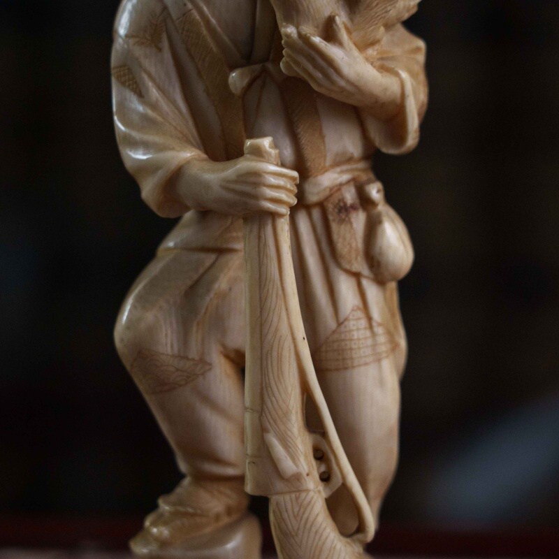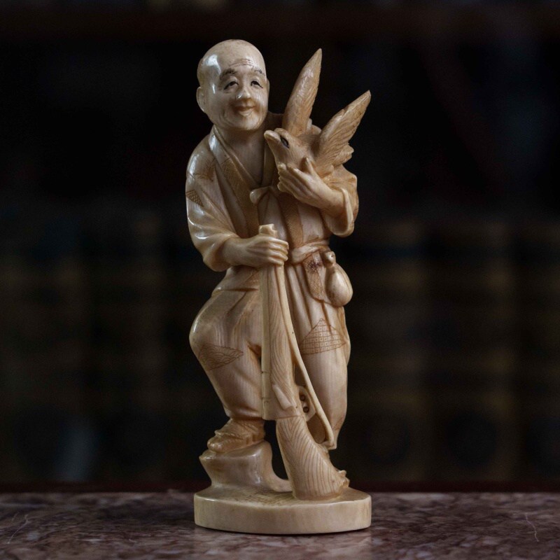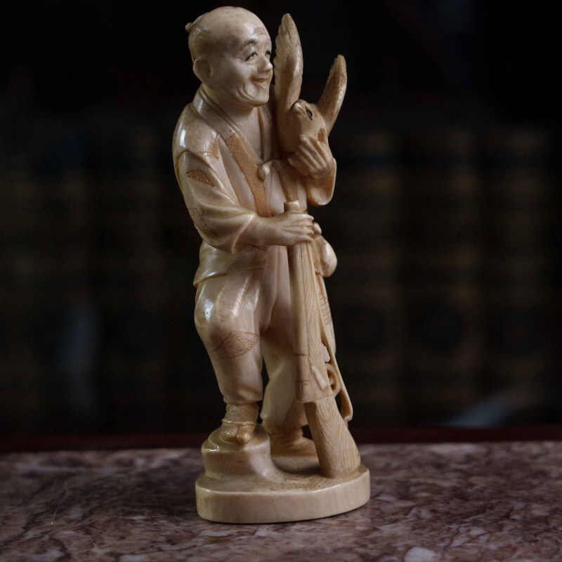 Сюжет с охотником и его добычей является распространенным мотивом в японских миниатюрных скульптурах, отражающим повседневную жизнь или фольклорные сюжеты. Фигурка отличается высокой степенью детализации, включая текстуру одежды, выражение лица. Окимоно представляет собой японского охотника, известного как матаги. Матаги — это традиционные охотники из региона Тохоку на севере Японии, которые веками жили в гармонии с природой, соблюдая строгие ритуалы и правила охоты. Окимоно символизирует традиционный японский образ жизни, мастерство охоты и уважение к природе и ее дарам. Охотники матаги известны своей уникальной культурой и передачей знаний из поколения в поколение.