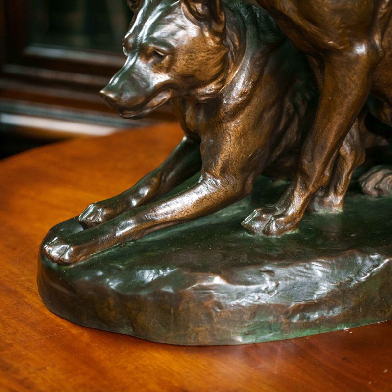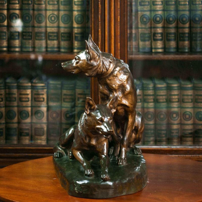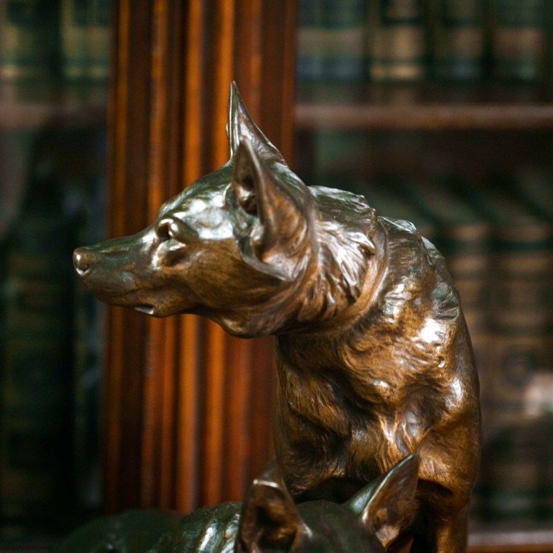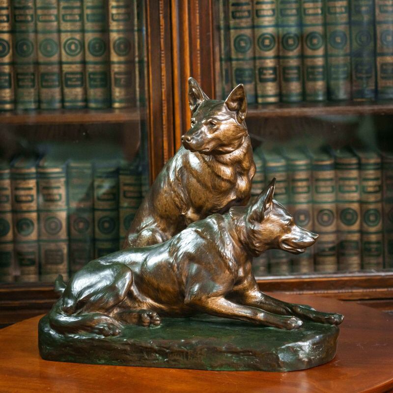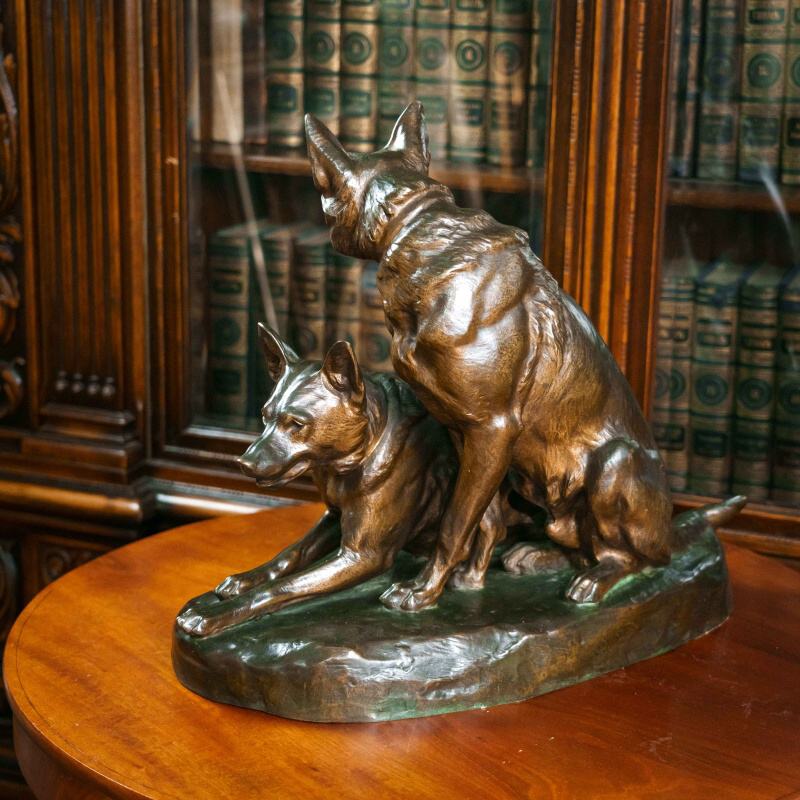 Бронзовая скульптурная композиция, созданная французским скульптором Луи Рише (Louis Riché, 1877-1949), изображает двух немецких овчарок, выполненных с высокой степенью реализма и вниманием к деталям. Скульптура изображает двух овчарок в естественной позе. Одна собака сидит настороженно, выпрямив уши, что символизирует бдительность и преданность. Вторая овчарка лежит рядом, она выглядит спокойной, что добавляет композиции ощущение гармонии и спокойствия. Овчарки изображены с анатомической точностью: видны рельефные мышцы, естественные изгибы тела и реалистично прорисованная шерсть. Особое внимание уделено выражению их морд, что придаёт фигурам живость и индивидуальность. Скульптура отлита из бронзы с приятным матовым оттенок, который подчёркивает рельеф и текстуру шерсти собак. Патинирование усиливает глубину теней, создавая реалистичные переходы между светом и тенью. Овчарки традиционно ассоциируются с преданностью, защитой и умом. В данной скульптуре две собаки символизируют верность и товарищество, а также баланс между силой и спокойствием.