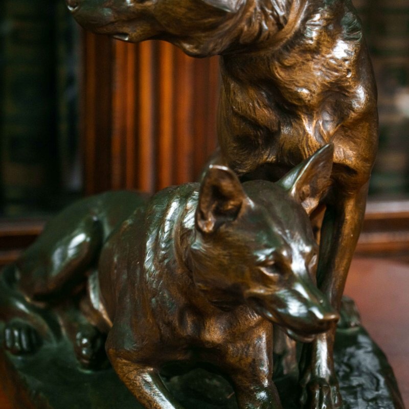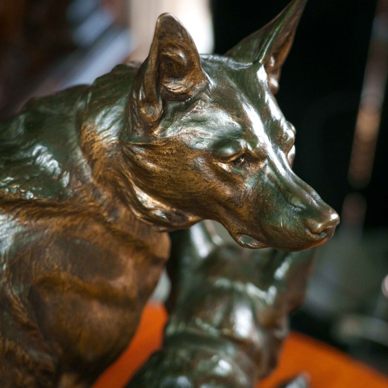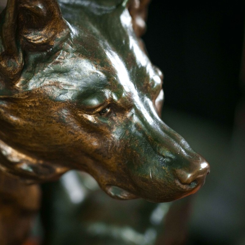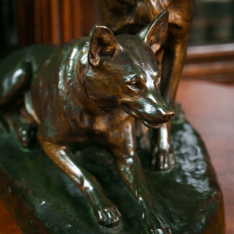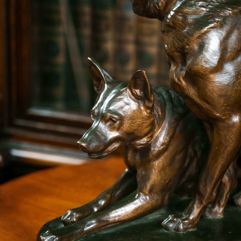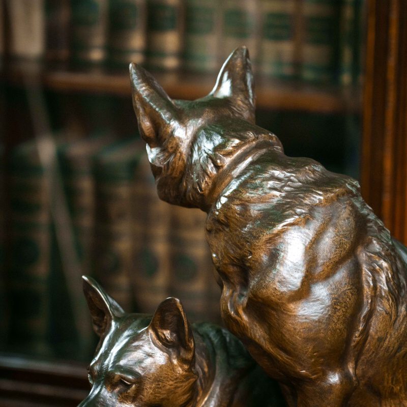 Бронзовая скульптурная композиция, созданная французским скульптором Луи Рише (Louis Riché, 1877-1949), изображает двух немецких овчарок, выполненных с высокой степенью реализма и вниманием к деталям. Скульптура изображает двух овчарок в естественной позе. Одна собака сидит настороженно, выпрямив уши, что символизирует бдительность и преданность. Вторая овчарка лежит рядом, она выглядит спокойной, что добавляет композиции ощущение гармонии и спокойствия. Овчарки изображены с анатомической точностью: видны рельефные мышцы, естественные изгибы тела и реалистично прорисованная шерсть. Особое внимание уделено выражению их морд, что придаёт фигурам живость и индивидуальность. Скульптура отлита из бронзы с приятным матовым оттенок, который подчёркивает рельеф и текстуру шерсти собак. Патинирование усиливает глубину теней, создавая реалистичные переходы между светом и тенью. Овчарки традиционно ассоциируются с преданностью, защитой и умом. В данной скульптуре две собаки символизируют верность и товарищество, а также баланс между силой и спокойствием.