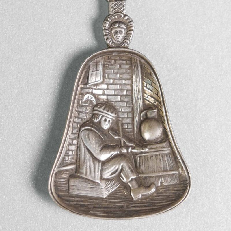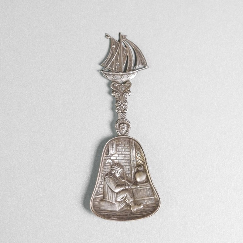 Памятная ложка, изготовленная в Голландии в I половине XX века, выполнена из серебра 833 пробы и отмечена клеймом в виде меча. Рукоять венчает миниатюрная фигура старинного парусного судна — символ морской мощи и торговых традиций Нидерландов. Черпак украшен рельефной сценой, изображающей ремесленника за работой, что отражает уважение голландцев к труду и ремеслу. Ажурный декор и стилизованное лицо в центральной части придают изделию выразительность и характер старинных мастеров. Подобные ложки создавались как памятные или коллекционные изделия, воплощая богатое культурное наследие и художественное мастерство нидерландских ювелиров I половины XX века.