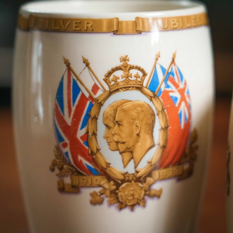 Пара коллекционных кружек, созданных в честь Серебряного юбилея (1910–1935) царствования короля Георга V и королевы Марии. На лицевой стороне изображены профили монархов в медальоне, увенчанном короной и обрамлённом лавровым венком, на фоне британских флагов. Под портретом — даты правления, над — надпись «Silver Jubilee». Обратная сторона украшена монограммой G & M под короной — символом королевской четы.