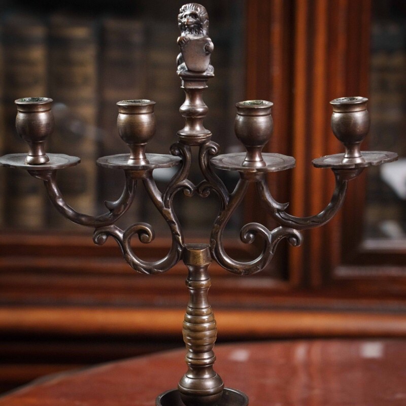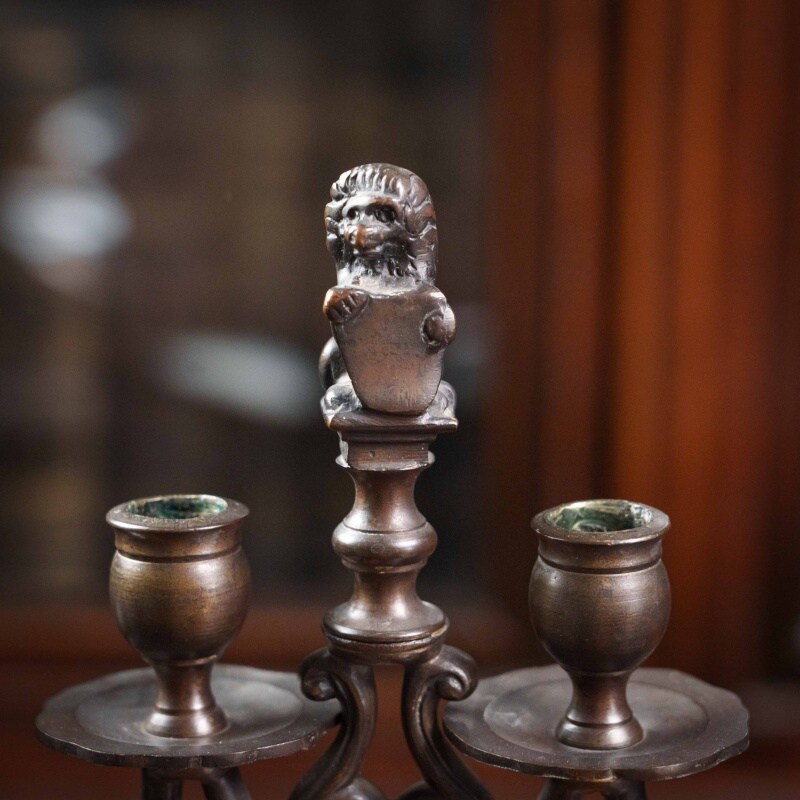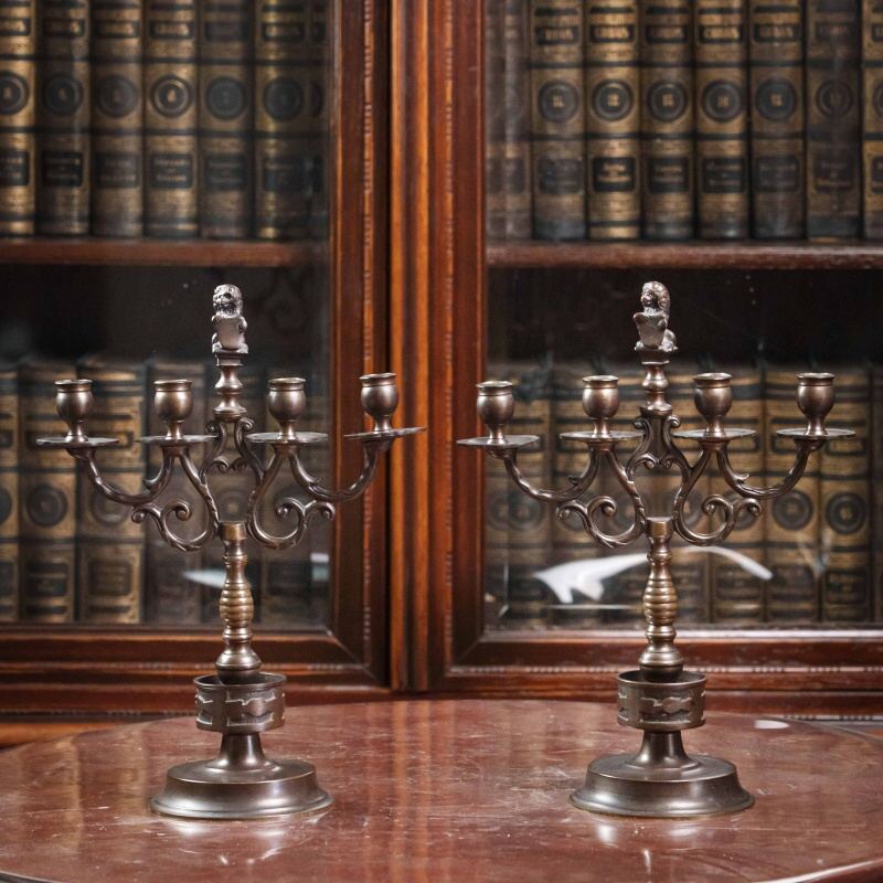 Пара массивных тяжелых бронзовых канделябров на 4 свечи, украшенных литой фигурой Баварского королевского льва с гербовым щитом, выполненных в XIX веке.