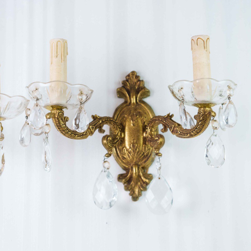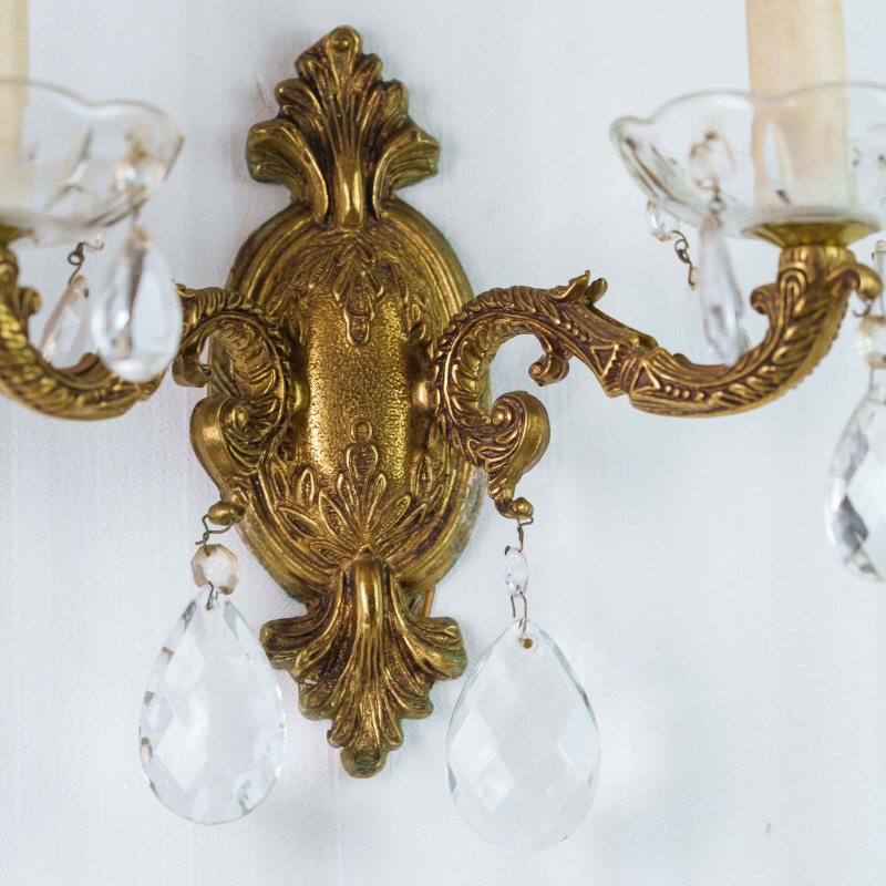 Каждое бра имеет два изогнутых рожка, декорированных стеклянными чашами и хрустальными подвесками каплевидной формы, которые мягко отражают свет, создавая игру бликов и тёплую атмосферу. Патроны стилизованы под свечи с потёками воска, что усиливает антикварный характер изделия.