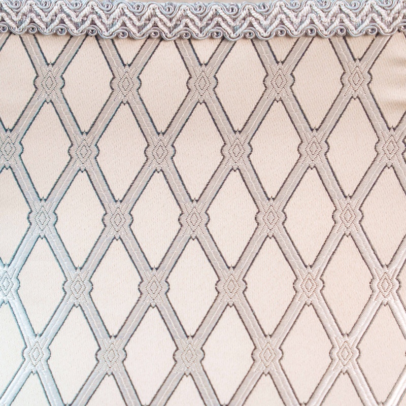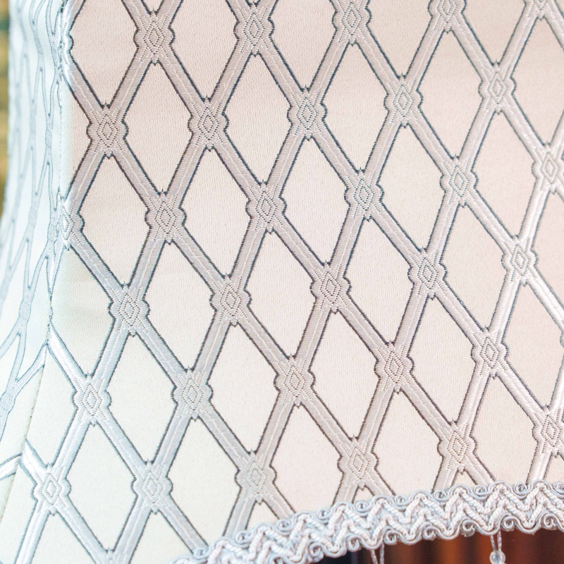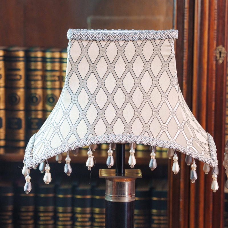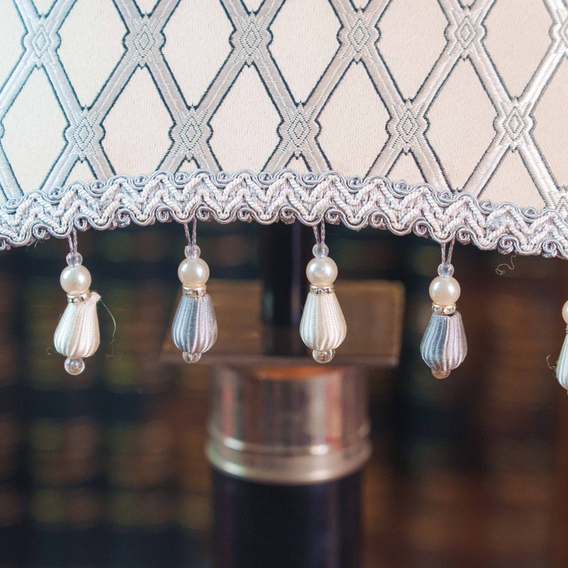 Светлые текстильные абажуры украшены геометрическим орнаментом и декоративной бахромой с подвесками, благодаря чему лампы создают мягкое и уютное освещение. Контраст между тёмным основанием и светлым абажуром делает композицию особенно гармоничной и выразительной.