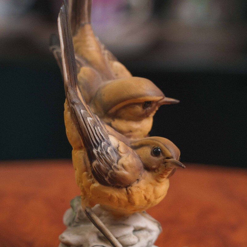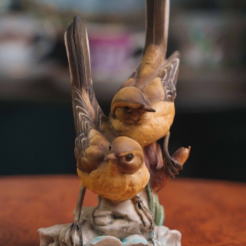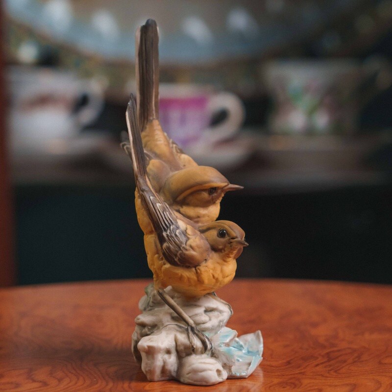 Элегантная фарфоровая композиция в итальянском стиле Capodimonte изображает двух птиц, расположившихся на скалистом выступе у воды. Скульптурная модель отличается выразительной пластикой и характерной для итальянских мастерских тщательной ручной росписью: тёплые охристые оттенки оперения мягко переходят в коричневые и серые тона, подчёркивая фактуру перьев и придавая фигурам реалистичность. Птицы представлены в живом взаимодействии — одна словно следит за происходящим, другая внимательно всматривается вперёд, что создаёт динамику и ощущение естественного поведения в природе.
