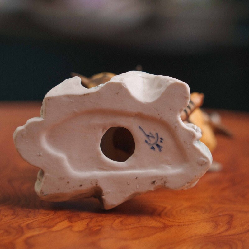 Основание выполнено в виде скалистого основания с элементами растительности и акцентами бирюзовой «водной» росписи. На донной части присутствует синее подглазурное клеймо, типичное для ряда итальянских фабрик, работавших в духе Capodimonte во II половине XX века.