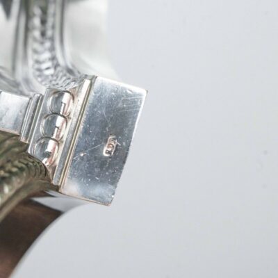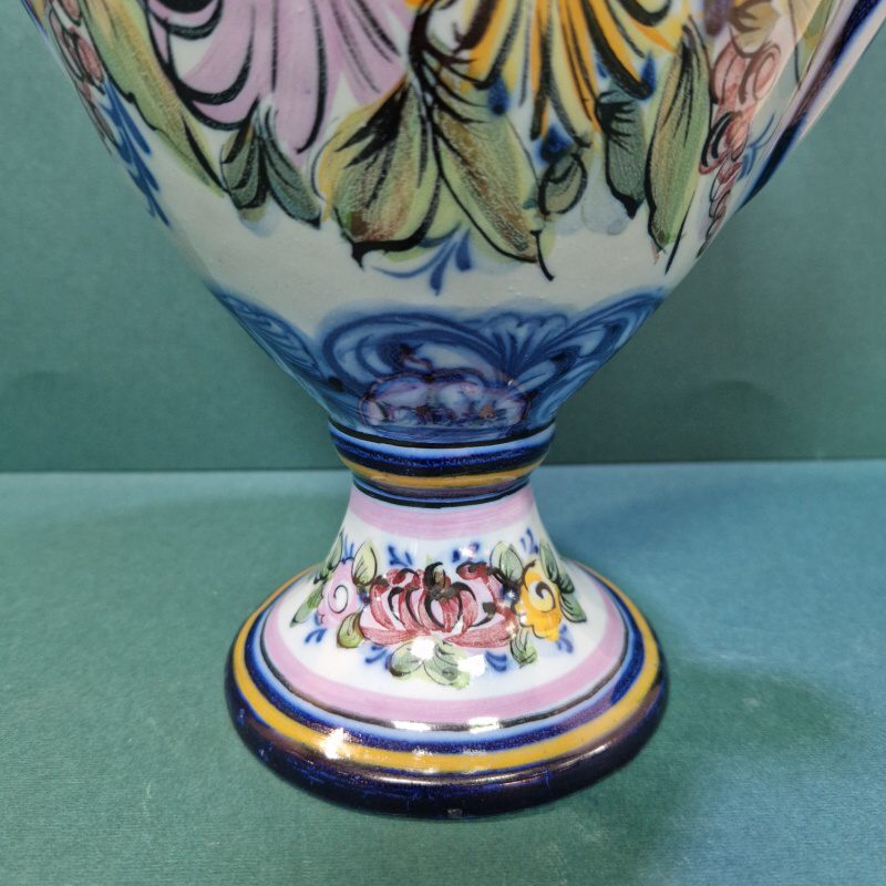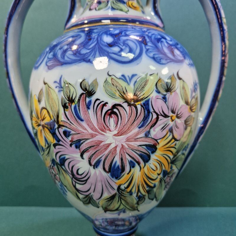Небольшой рельеф и густое нанесение краски придают орнаменту живописную глубину, а кобальтовые акценты и синяя кайма подчеркивают художественную традицию Алкобасы. Форма подставки и горловины дополнена цветочными гирляндами, создающими гармоничную композицию по всей поверхности вазы.