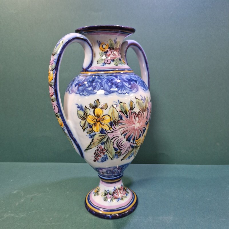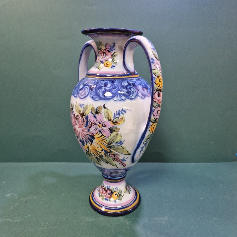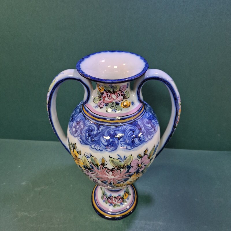 Изделие имеет изящную амфорную форму с двумя плавно изогнутыми ручками и широкой раструбной горловиной, украшенной букетами роз и садовых цветов.