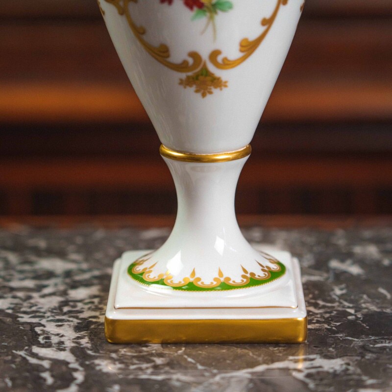 Белоснежный фарфор служит идеальным фоном для насыщенного орнамента: сочная зелень, тонко прописанные цветы и щедрая позолота образуют гармоничную композицию, навеянную традициями европейского классицизма.