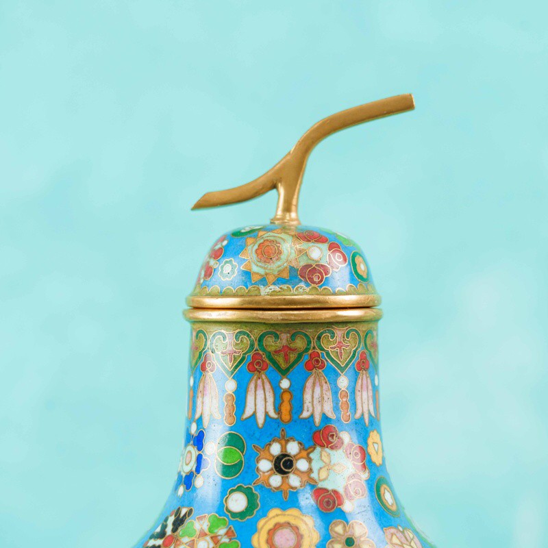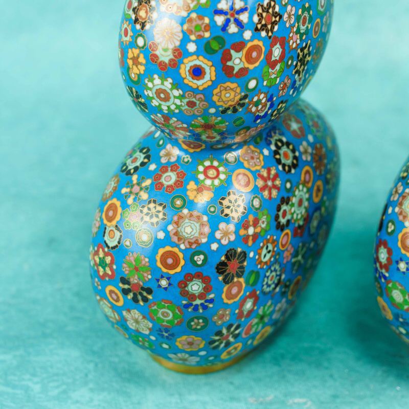 Поверхность ваз покрыта насыщенной бирюзово-синей эмалью и полностью украшена сложным орнаментом в технике, имитирующей millefiori — многоцветные розетты, геометрические и цветочные мотивы, выполненные в красных, зелёных, белых, жёлтых и чёрных тонах с тонкими золотыми контурами. Плотность узора создаёт эффект драгоценной мозаики и придаёт предметам особую декоративную насыщенность.