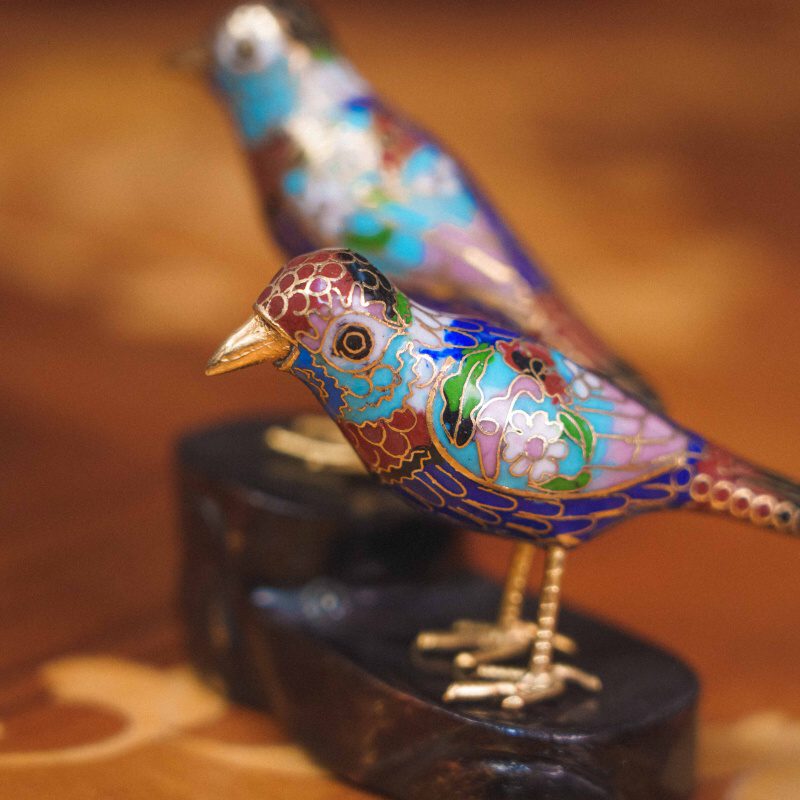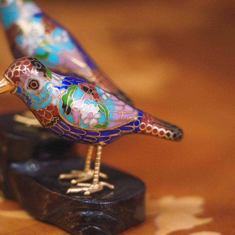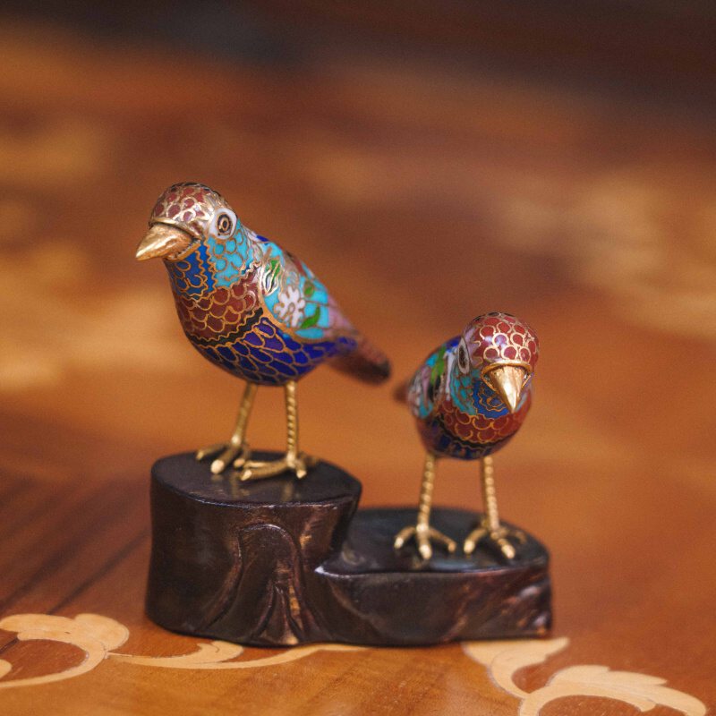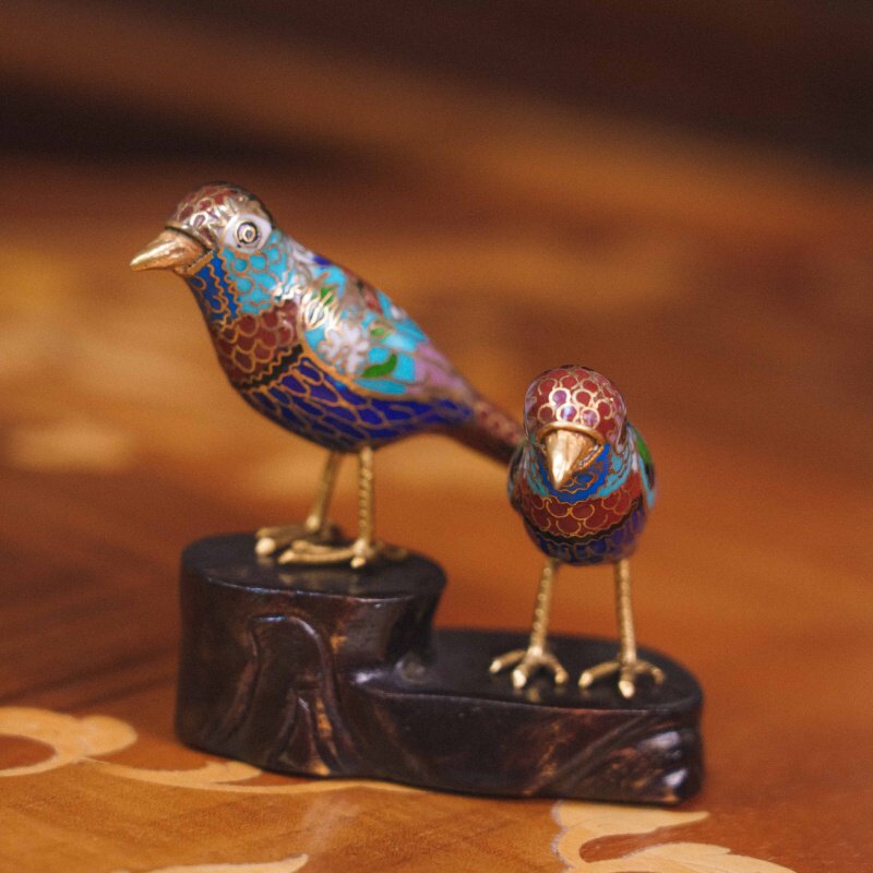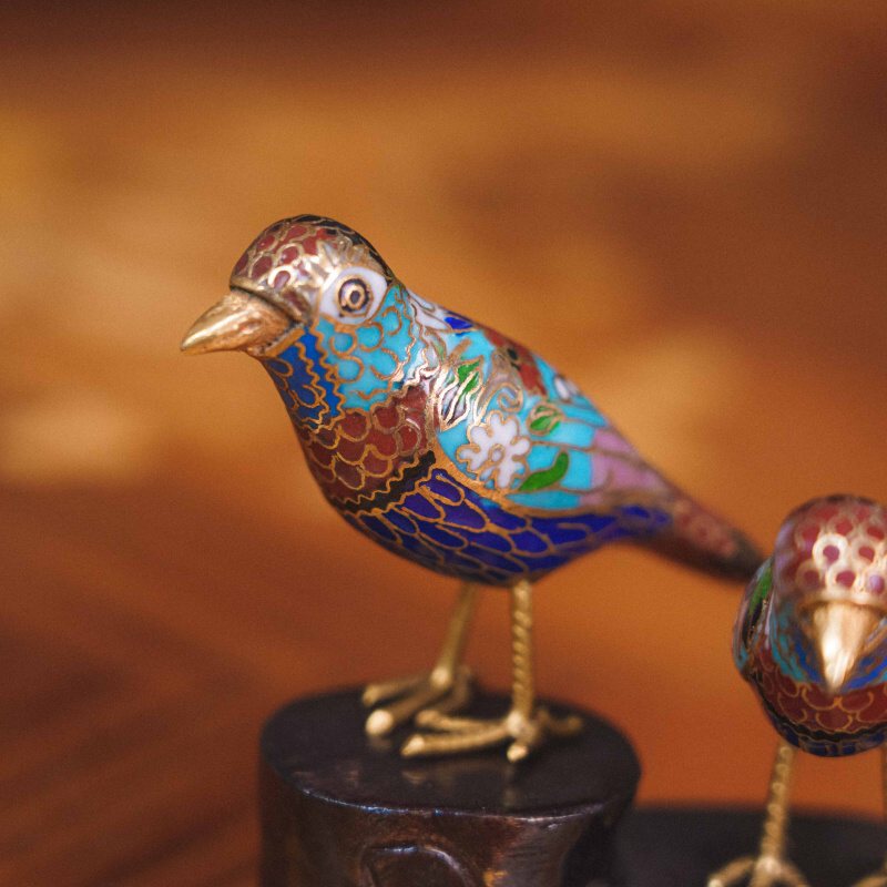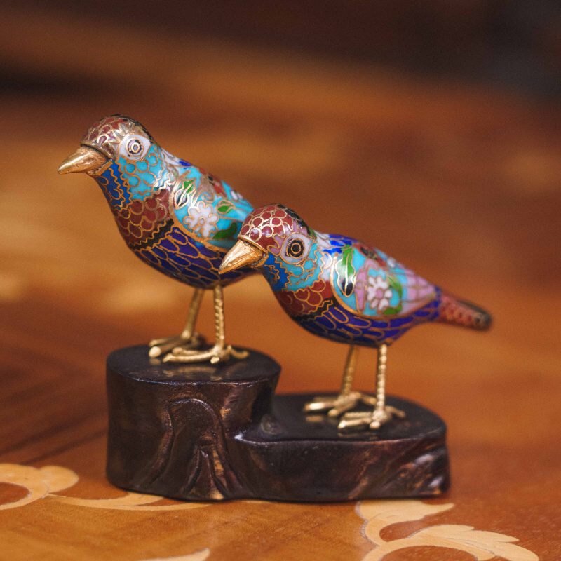 Изящная композиция из двух птичек, выполненная в традиционной китайской технике клуазоне — искусстве перегородчатой эмали с тонкой ручной проработкой и яркой декоративной палитрой.