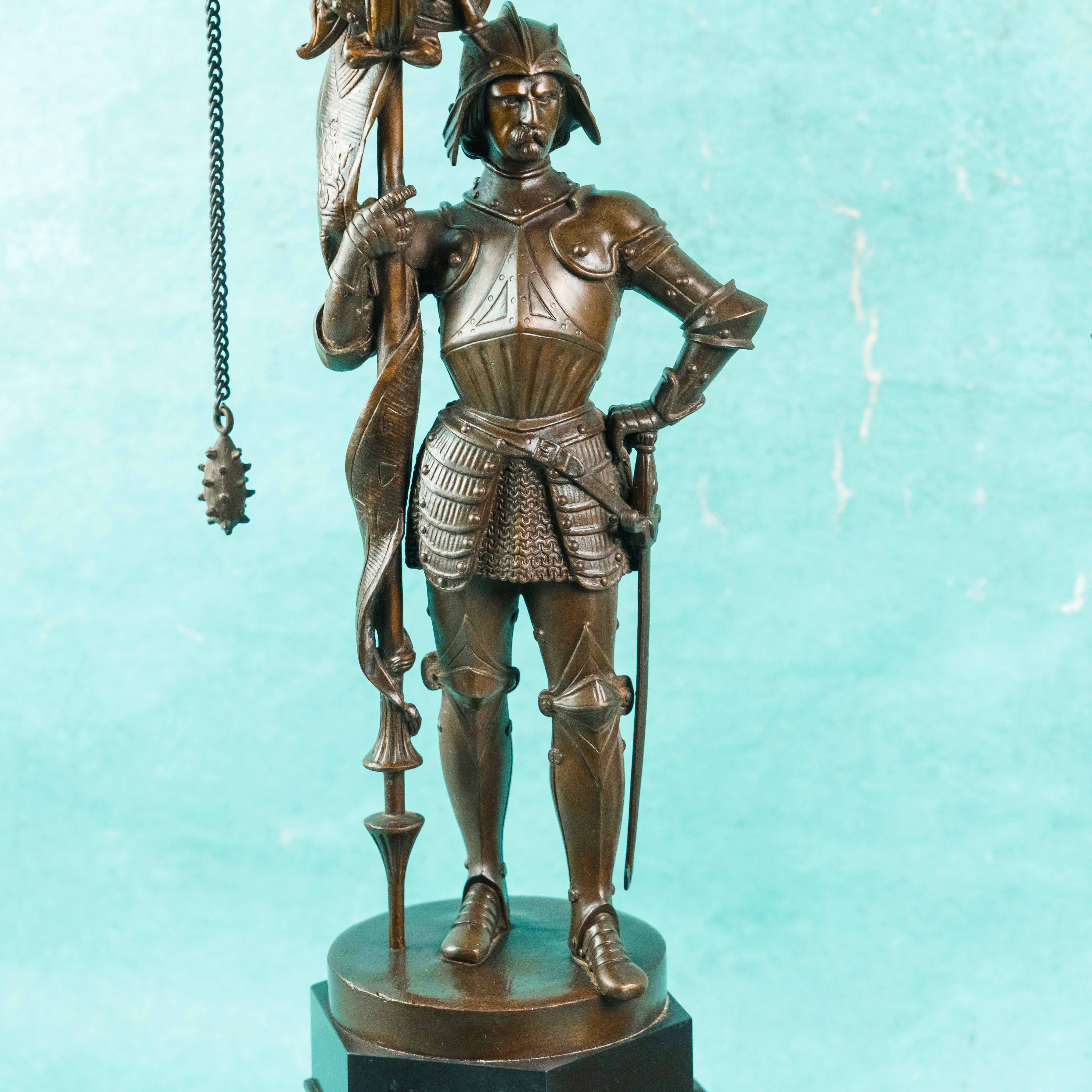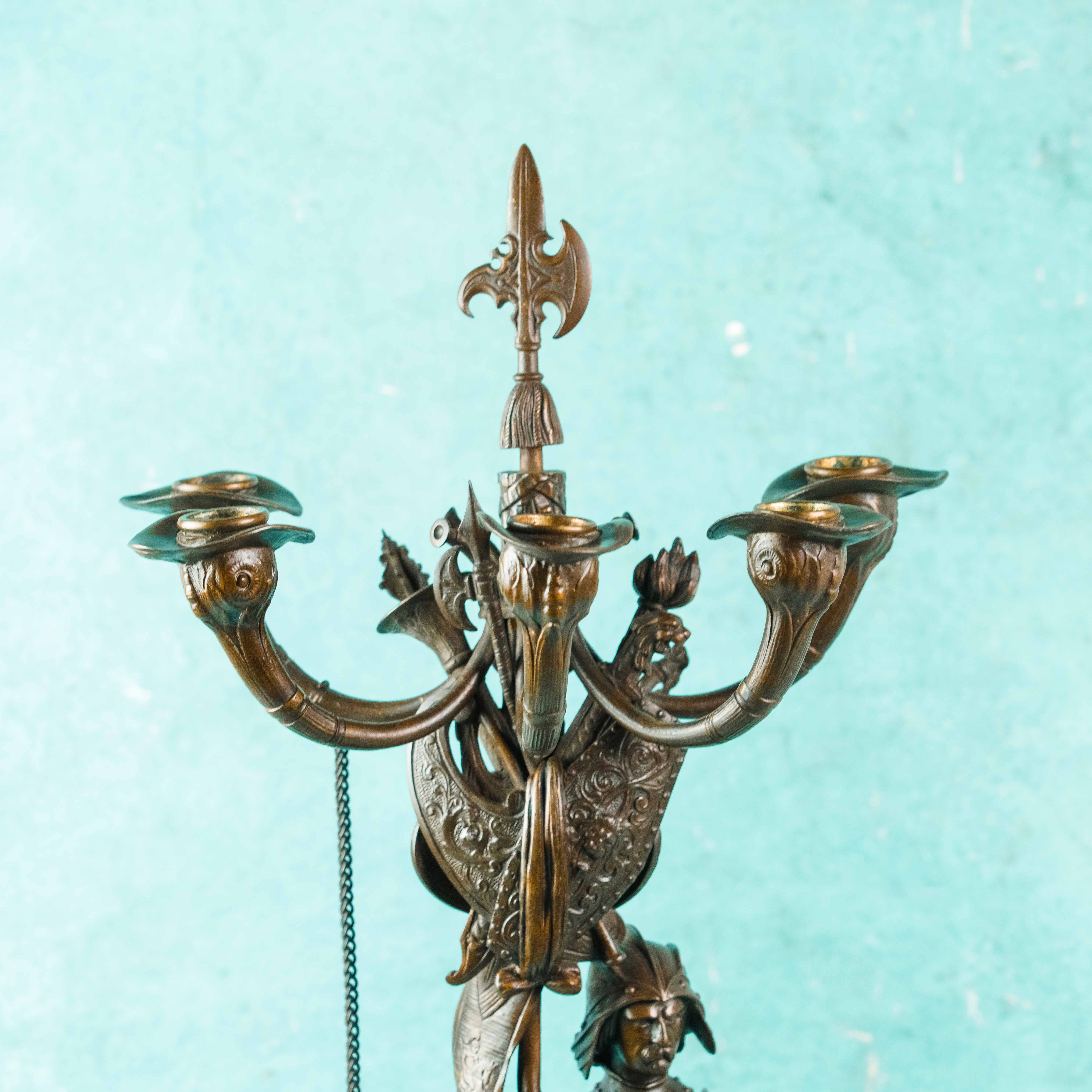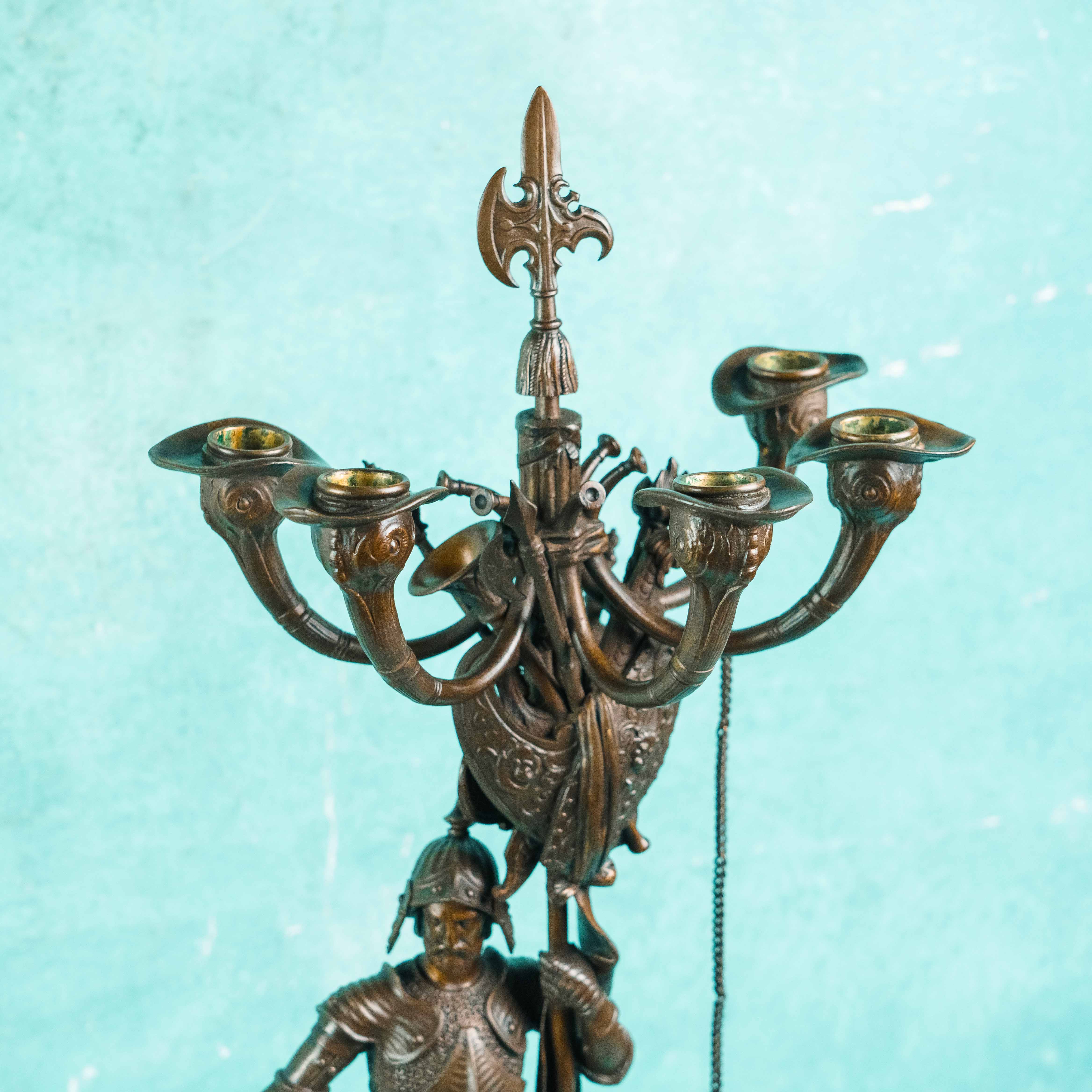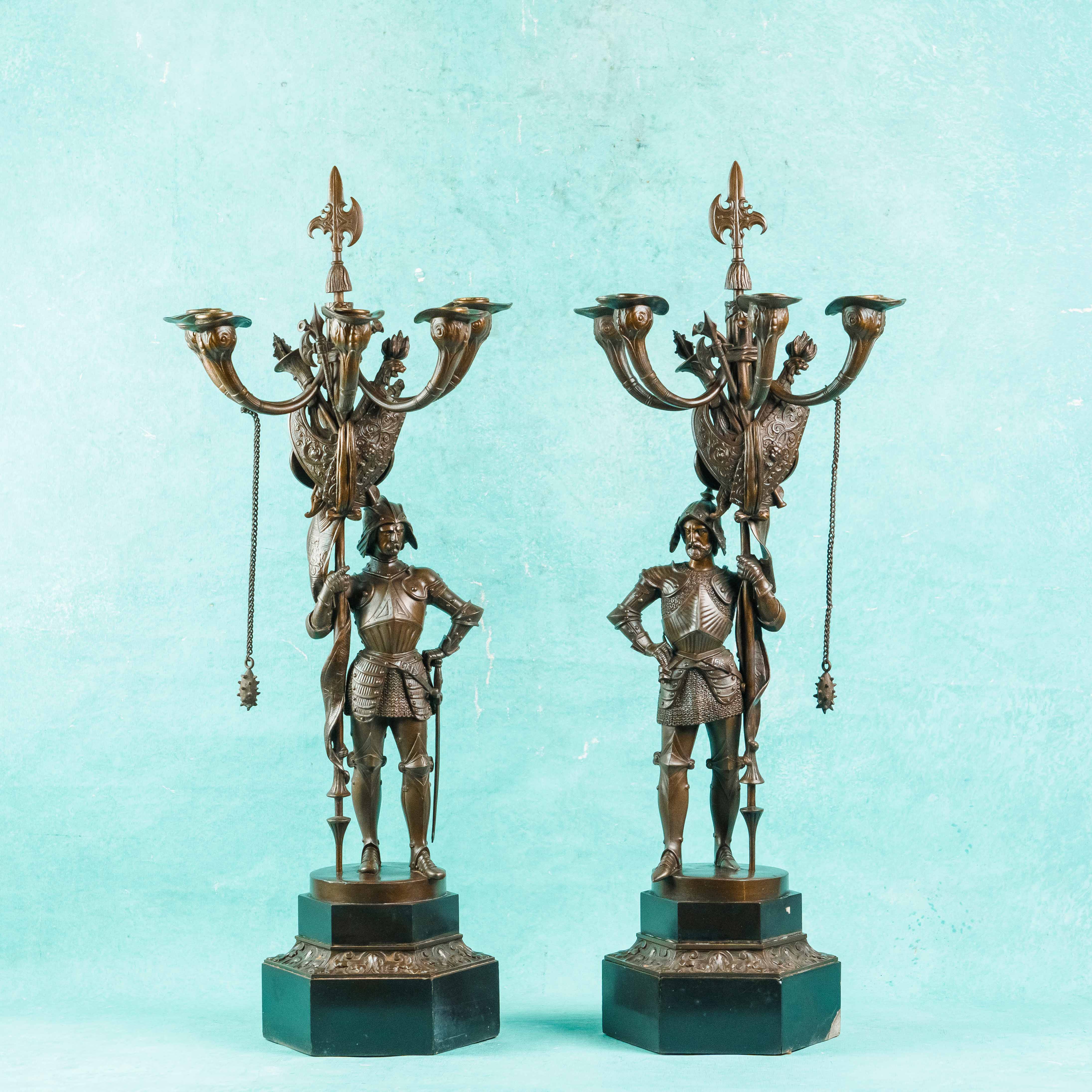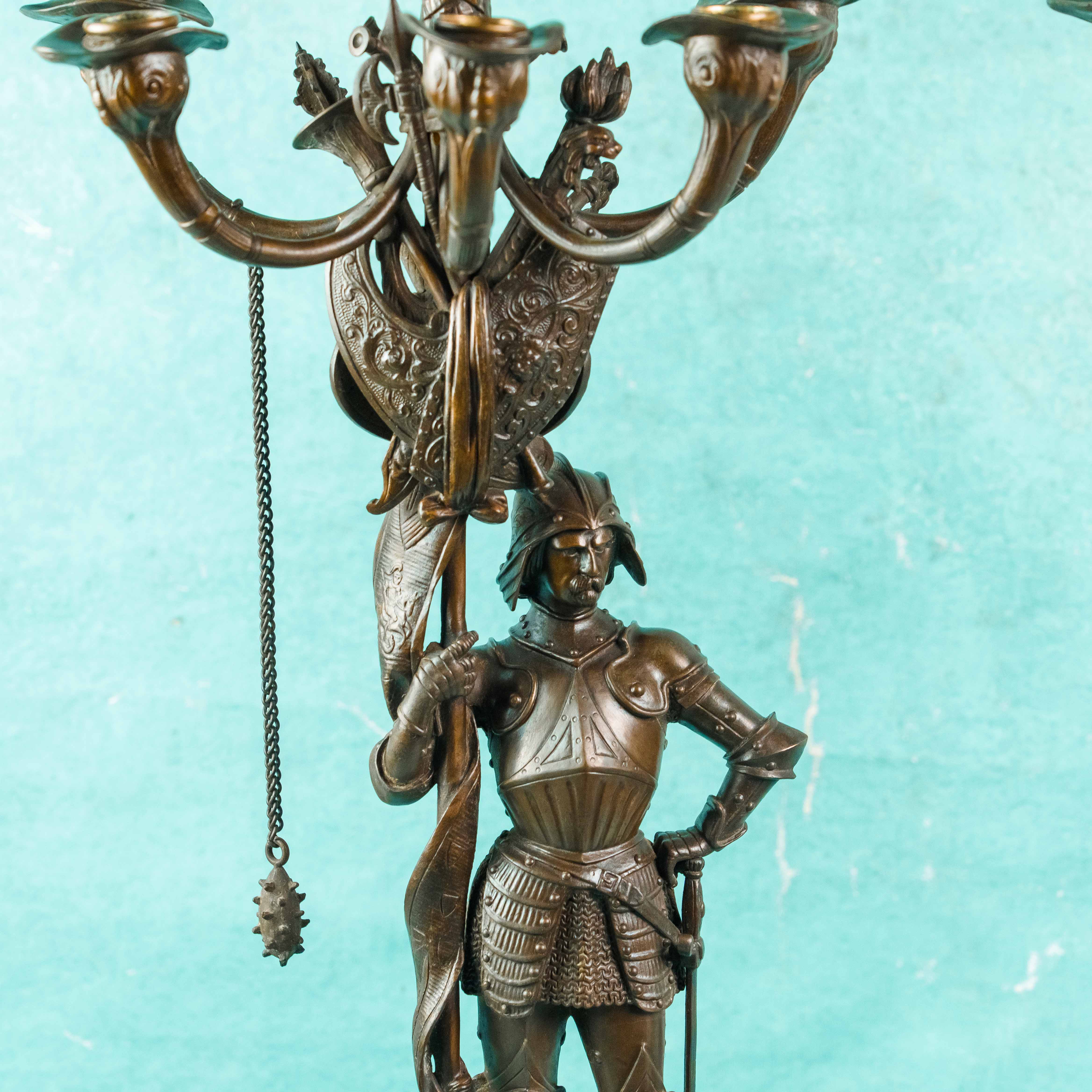 Парные бронзовые канделябры, выполненные в виде стоящих рыцарей в полном вооружении, держащих древки с многорожковыми светильниками. Фигуры облачены в детально проработанные доспехи, включающие нагрудники, наплечники, поножи и элементы кольчужного плетения. Позы персонажей уверенные и статичные, что подчёркивает их монументальный и торжественный характер.