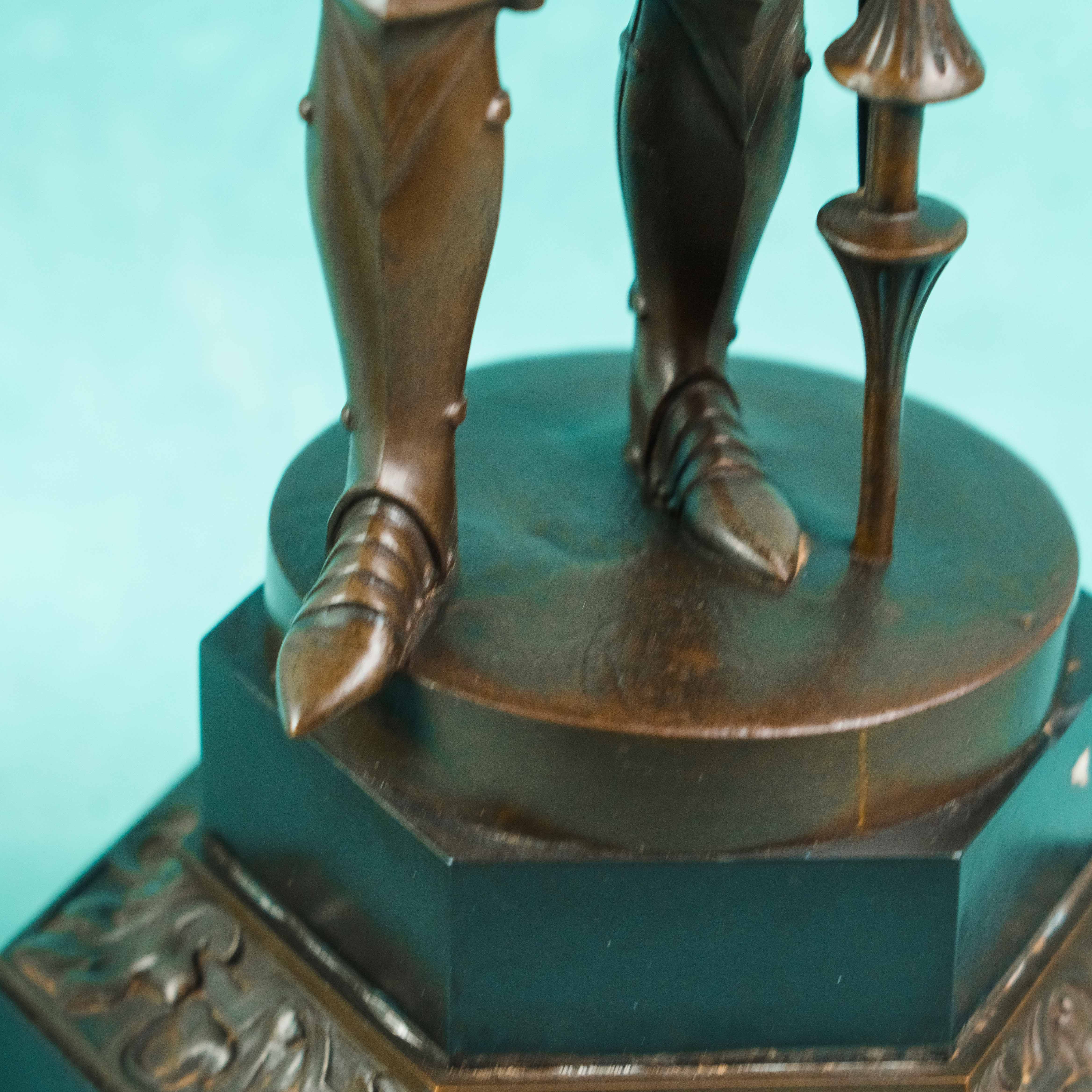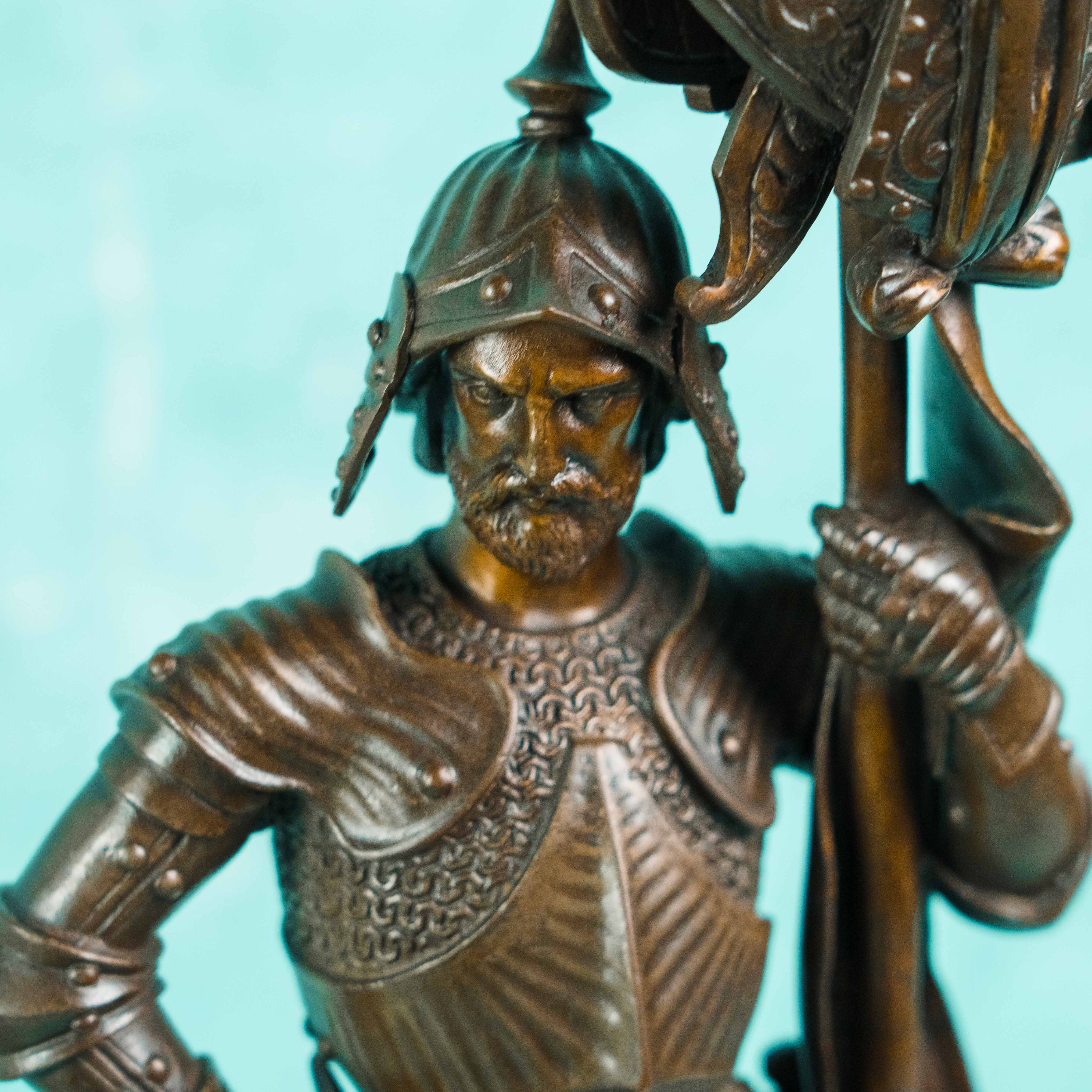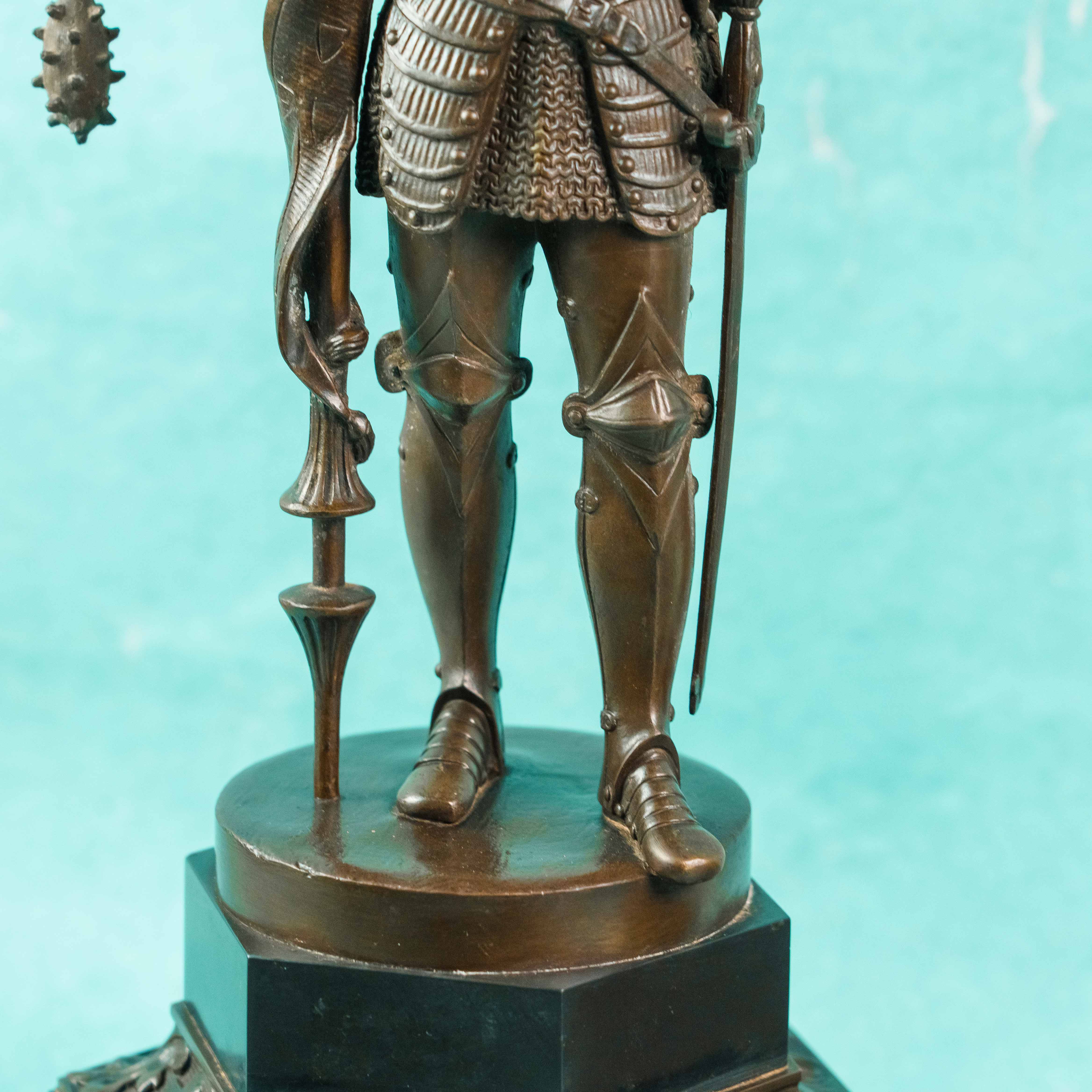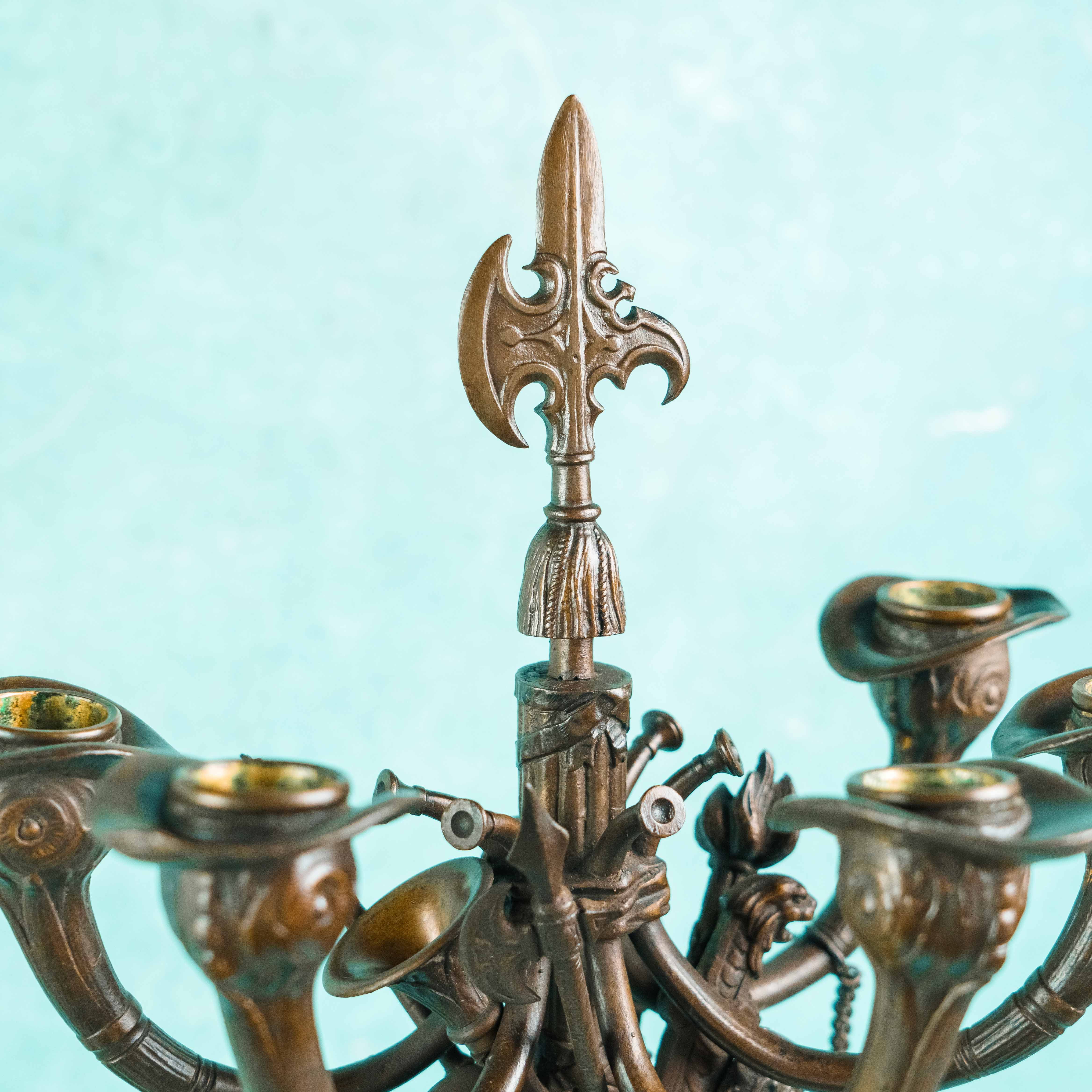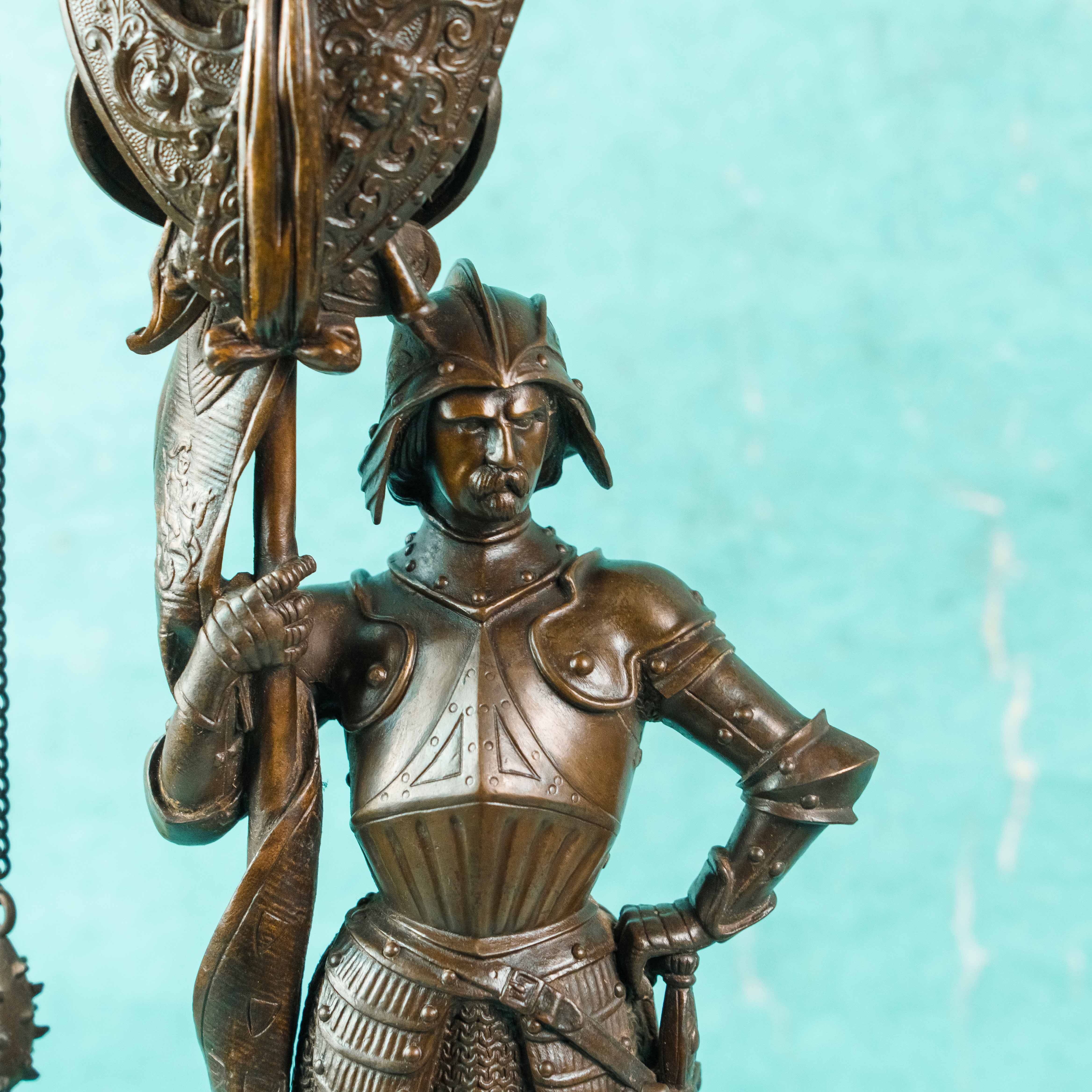 Парные бронзовые канделябры, выполненные в виде стоящих рыцарей в полном вооружении, держащих древки с многорожковыми светильниками. Фигуры облачены в детально проработанные доспехи, включающие нагрудники, наплечники, поножи и элементы кольчужного плетения. Позы персонажей уверенные и статичные, что подчёркивает их монументальный и торжественный характер.