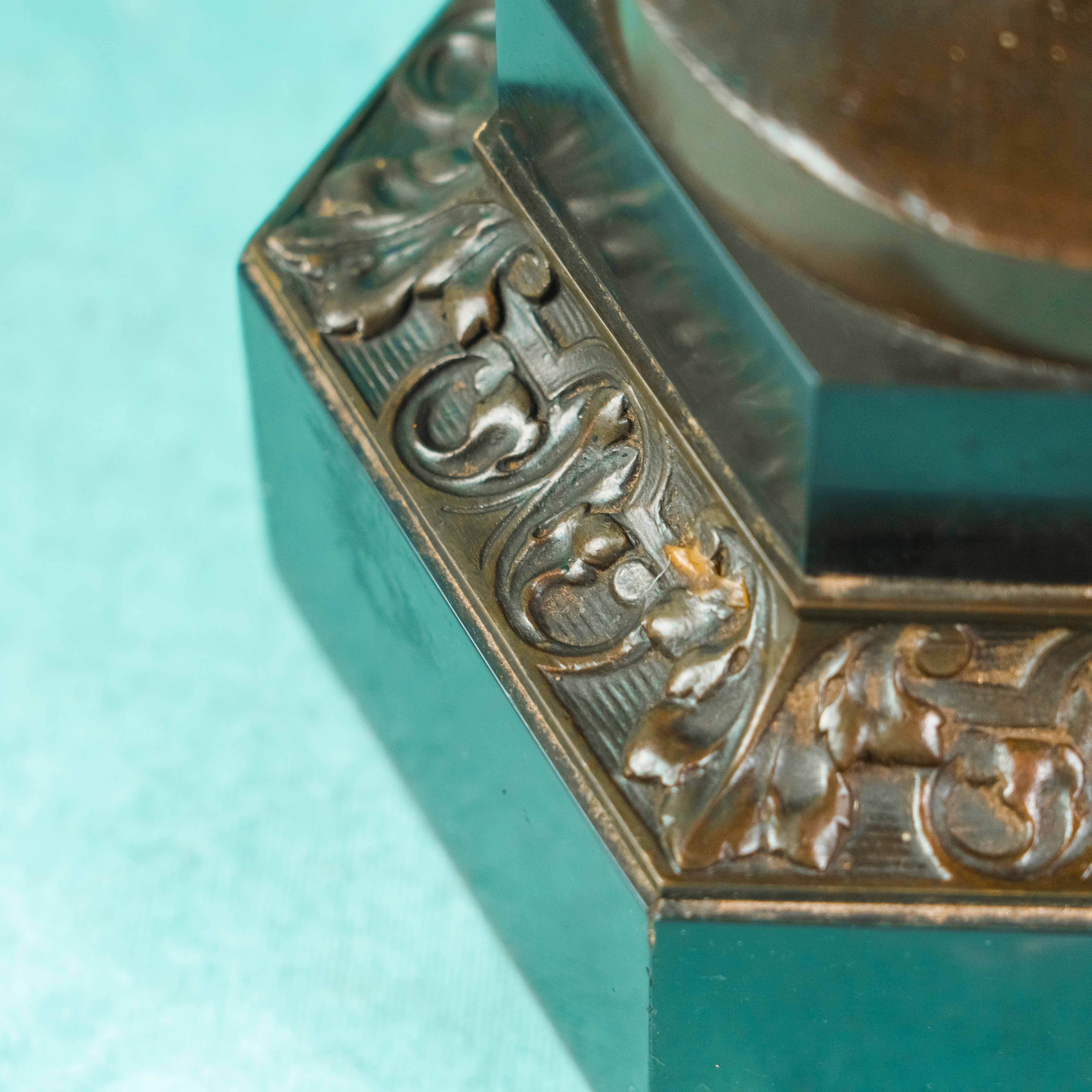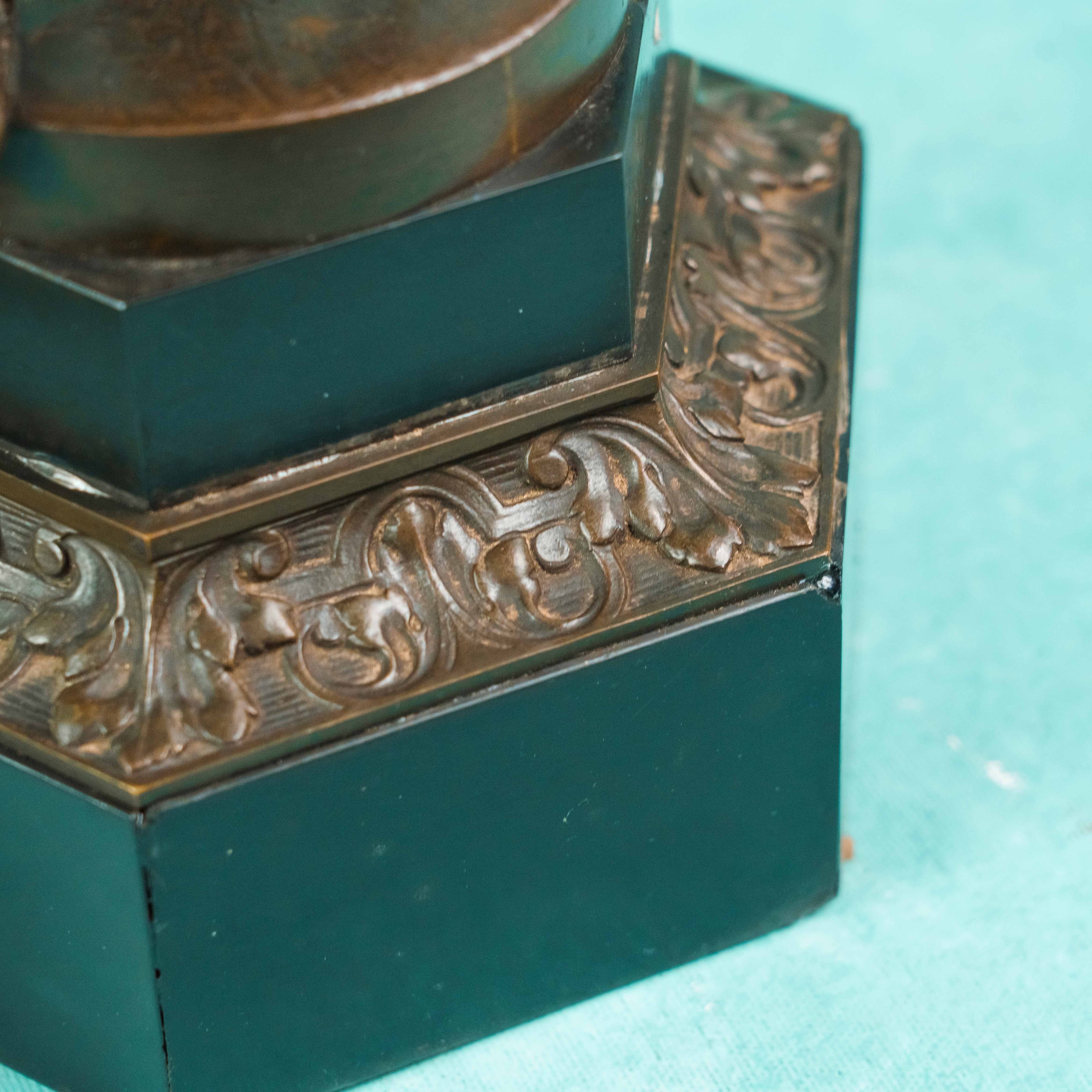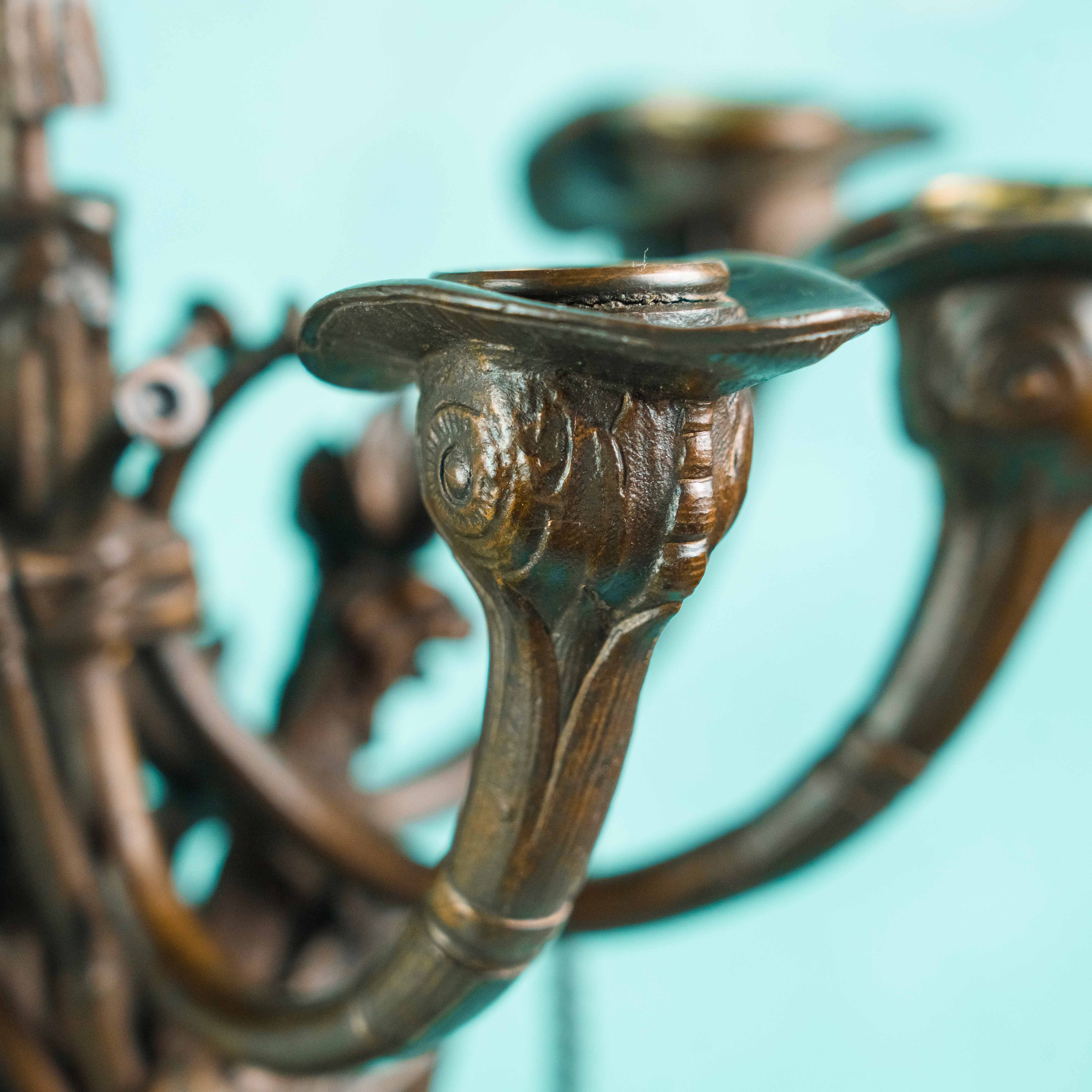 Верхняя часть канделябров оформлена в виде разветвлённых рожков, украшенных растительным орнаментом и стилизованными декоративными элементами. Композиции дополнены цепочками с подвесными декоративными деталями, что придаёт предметам динамику и изящество. Основания выполнены в виде многоугольных постаментов из тёмного камня, декорированных бронзовыми накладками с рельефным орнаментом.