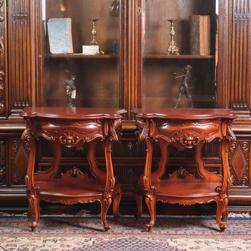 Эти парные антикварные комоды представляют собой изысканный образец мебельного искусства в духе позднего барокко и рококо, где декоративная насыщенность сочетается с гармоничной симметрией и продуманной конструкцией.