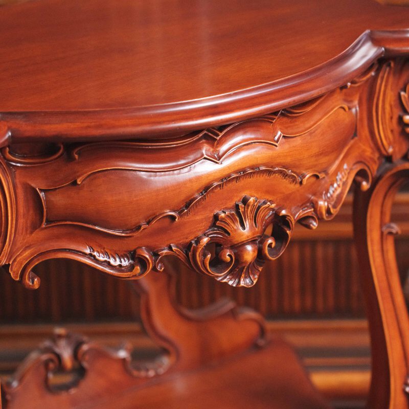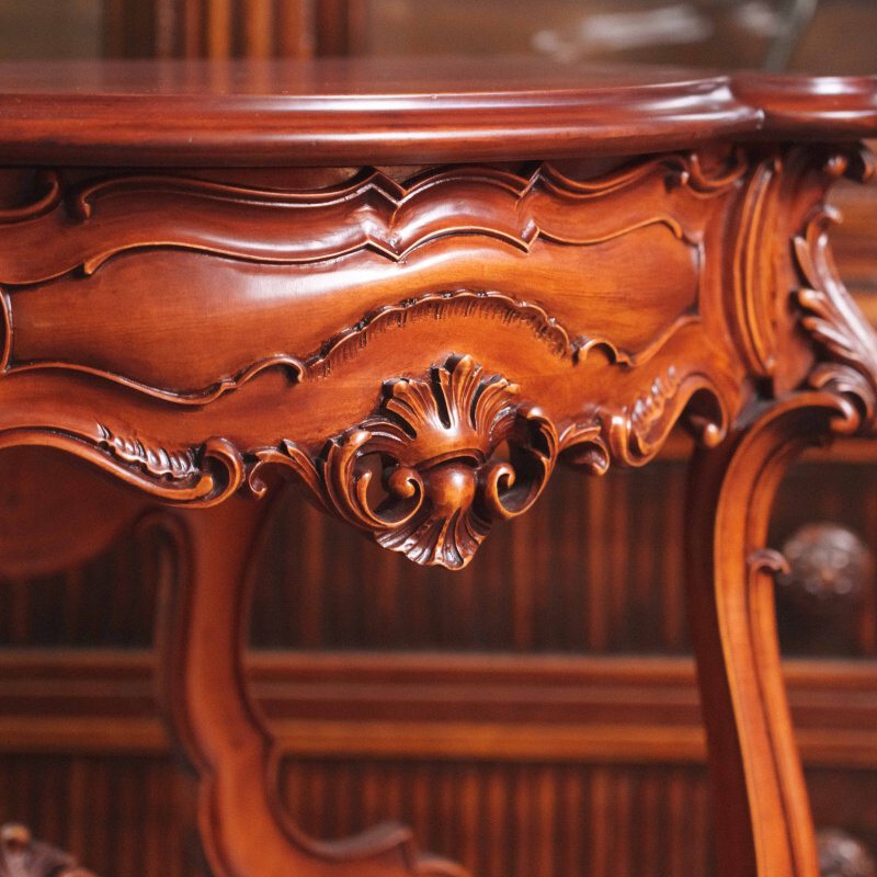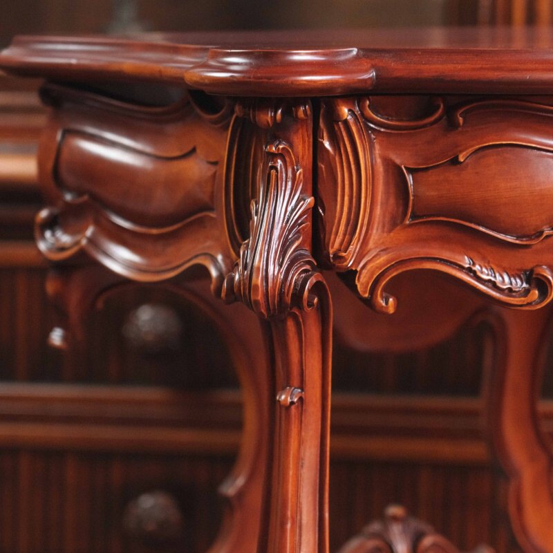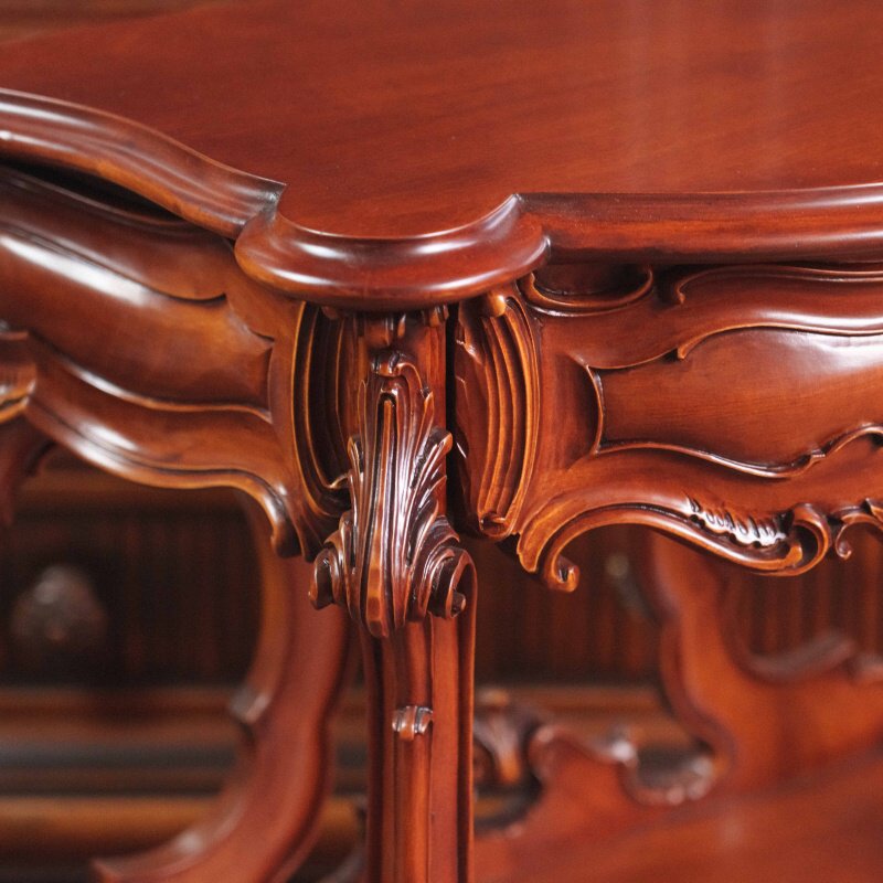 Конструкция открытая: между верхней столешницей и нижней полкой образуется воздушное пространство, обрамлённое волнообразными резными планками и декоративными боковыми стойками, напоминающими миниатюрные колонны с богатой деталировкой.