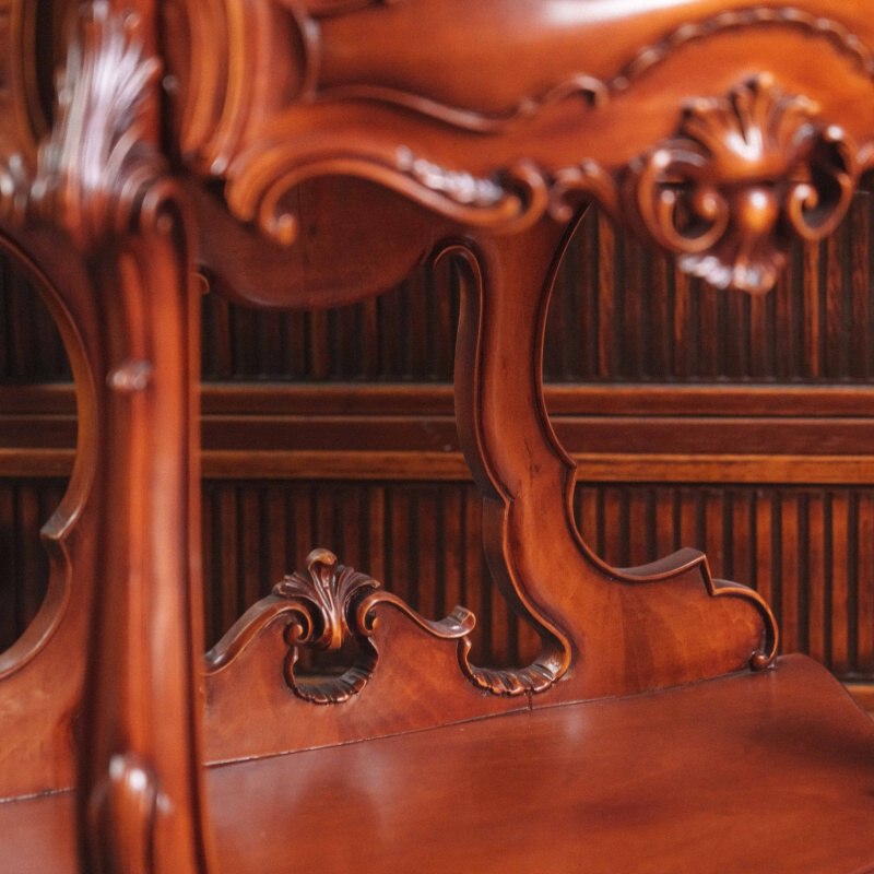 Оба предмета выполнены из благородного тёплого дерева с глубоким, ровным оттенком, подчёркивающим плавность линий и выразительность резьбы. Корпус каждого комода построен на изогнутых опорных стойках, переходящих в изящные кабриольные ножки, украшенные резными растительными мотивами и плавными завитками, создающими впечатление лёгкости и динамики.