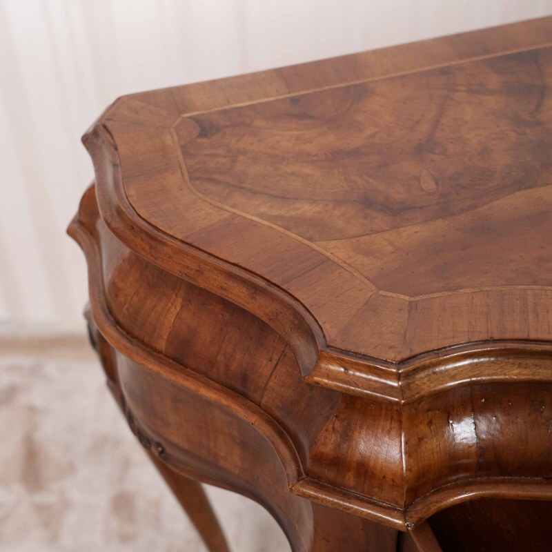Материал: Корпус и столешница выполнены из дерева, облицованного шпоном с красивой текстурой, (возможно, корень ореха или палисандр, что придает им богатый, теплый оттенок.
