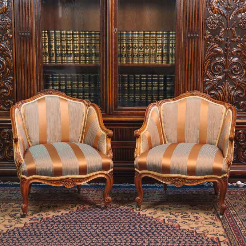 Перед вами великолепный дуэт — пара антикварных кресел бержер (Bergère) в стиле Людовика XV, истинное воплощение французского комфорта и камерной роскоши середины XVIII века.
