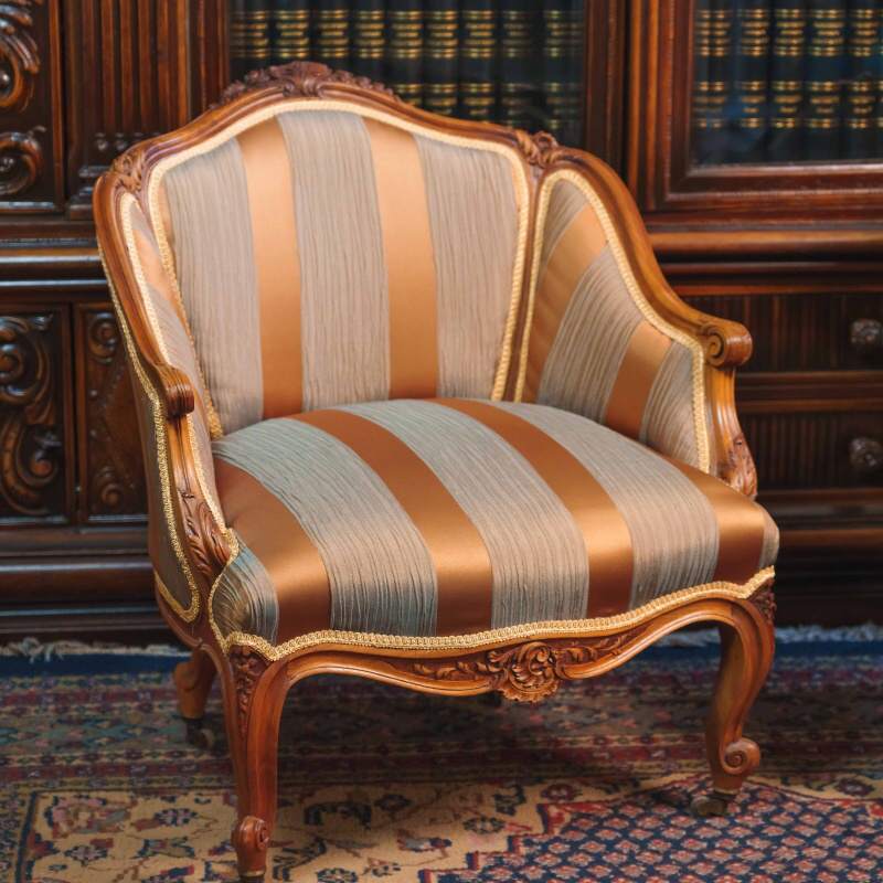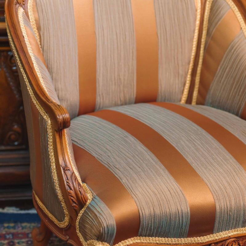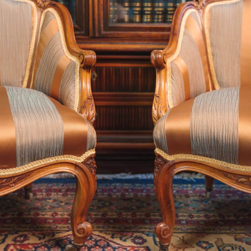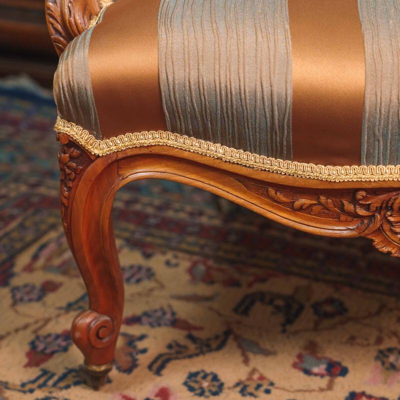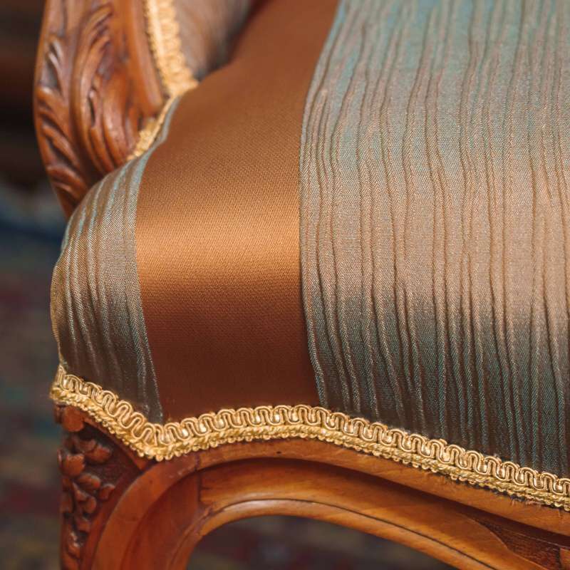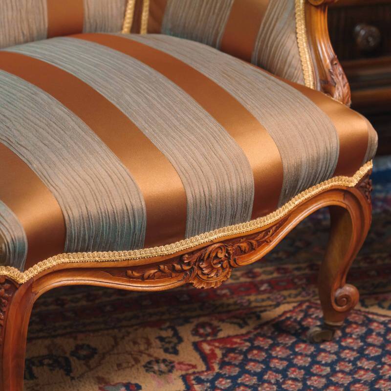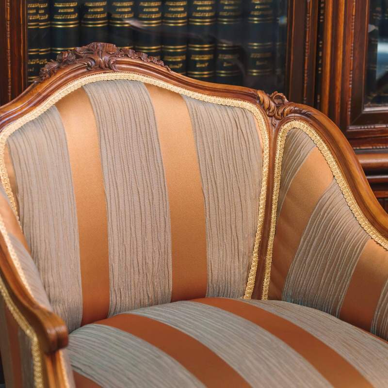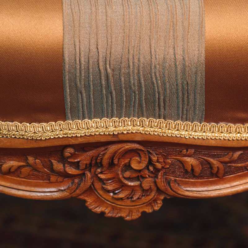 Спинки типа en cabriolet (слегка вогнутые) мягко обнимают сидящего, переходя в монолитные боковины. Каркасы выполнены из светлого орехас нежным золотистым отливом. Благородная полировка подчеркивает изящество ручной резьбы.
