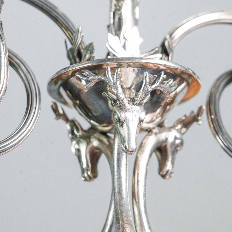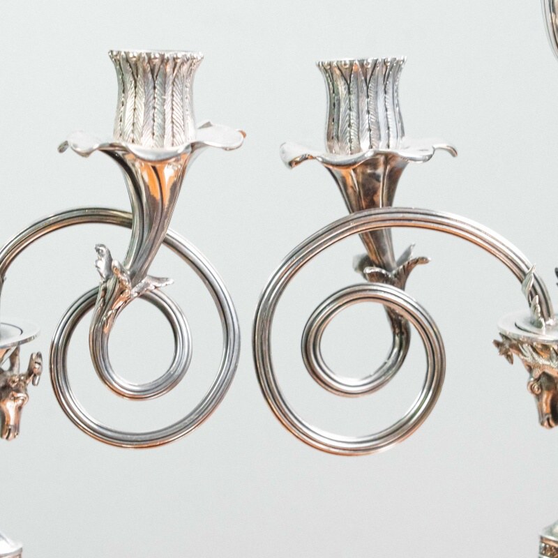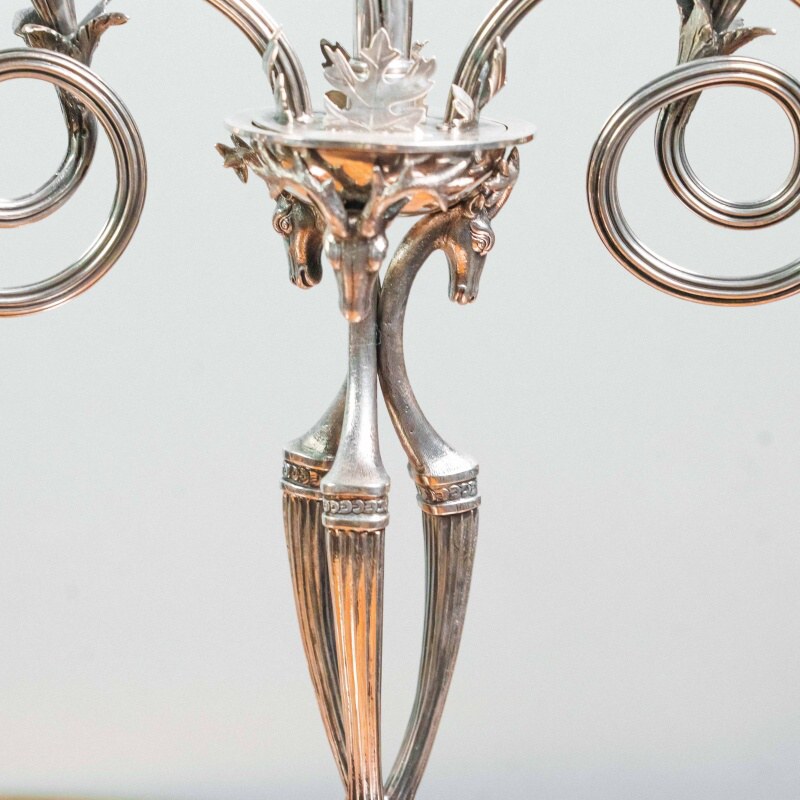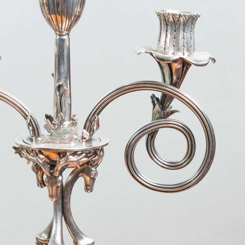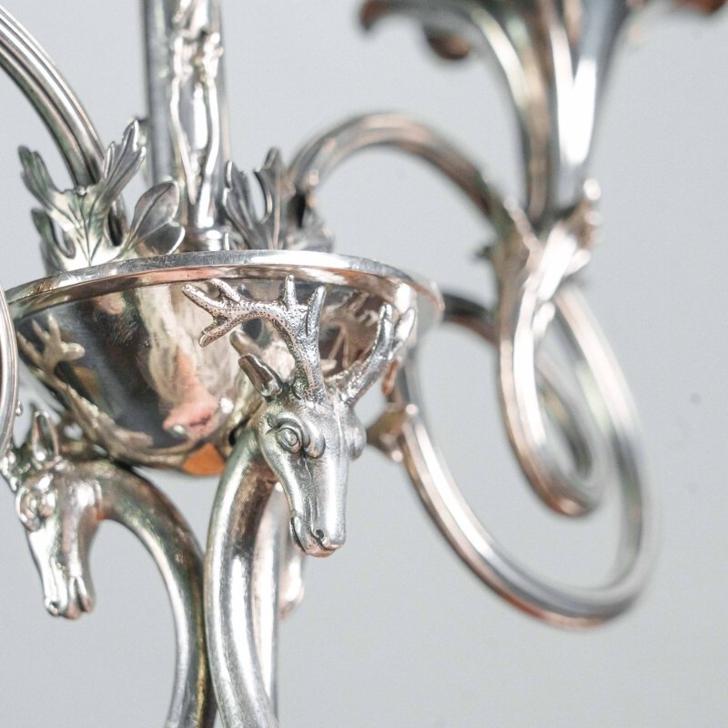 Каждый канделябр рассчитан на три свечи: центральная чаша возвышается над двумя боковыми рожками, плавно переходящими в изящные завитки. Подсвечники выполнены в форме раскрытых цветков с рифлёными лепестками, а в основании ветвей расположены головы оленей — символ благородства, природной силы и духовного обновления. Листья дуба, венчающие центральную часть, подчёркивают связь с античной традицией, где дуб считался священным деревом Зевса.