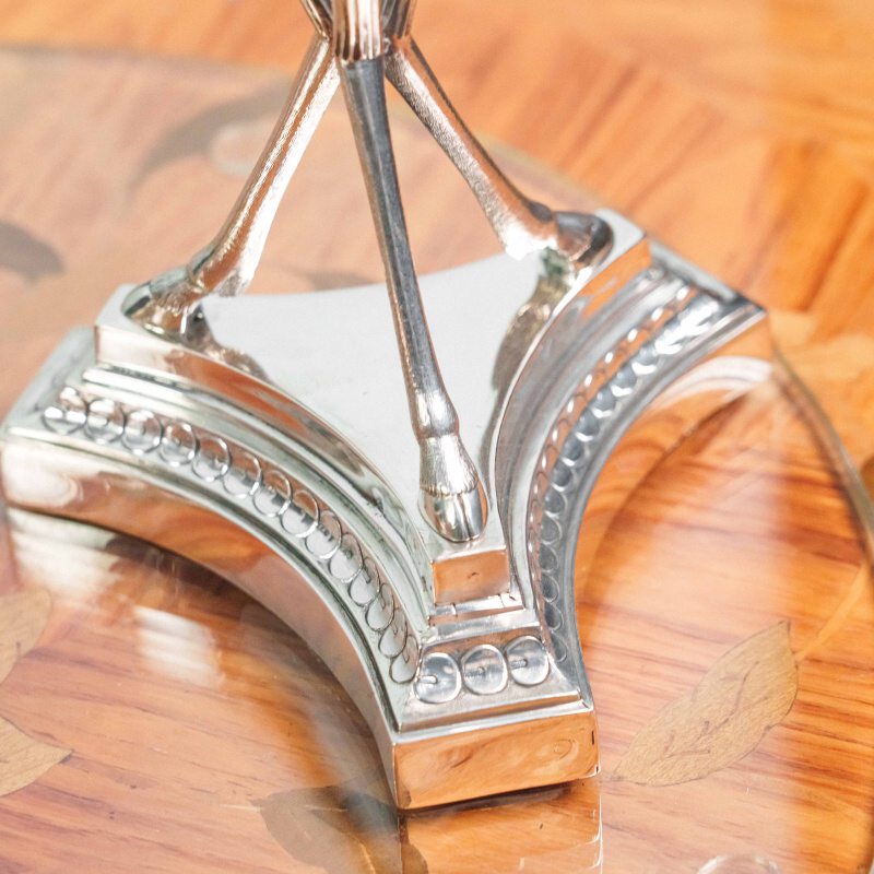 Триножие, поддерживающее корпус, оформлено в виде стилизованных колонн с каннелюрами, переходящих в изящные копыта, что придаёт конструкции лёгкость и динамику. Основание украшено рельефным бордюром с орнаментом из жемчужин и геометрических мотивов, создающим ощущение монументальности и гармонии.