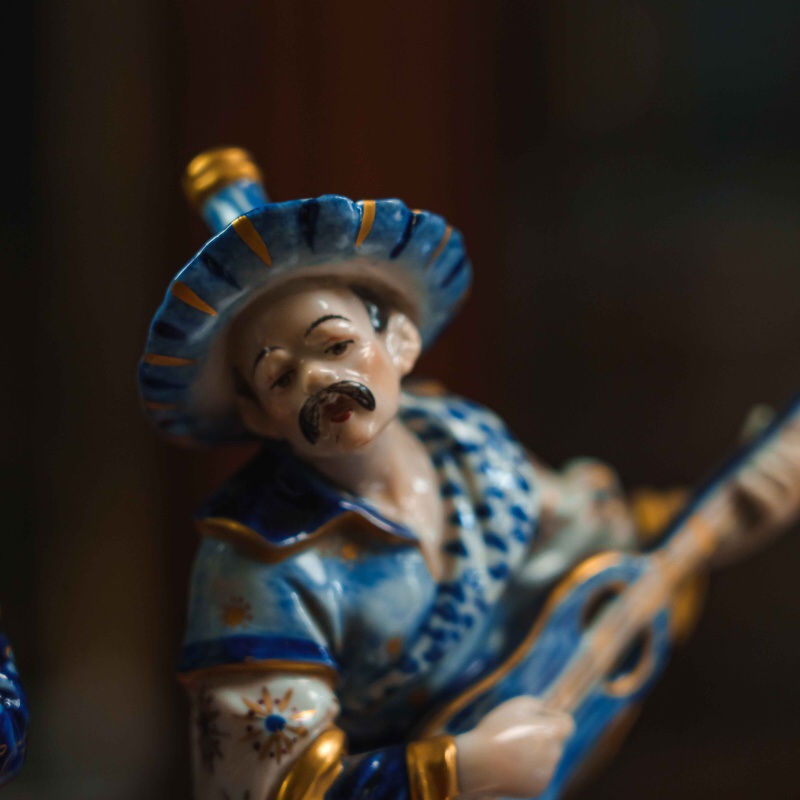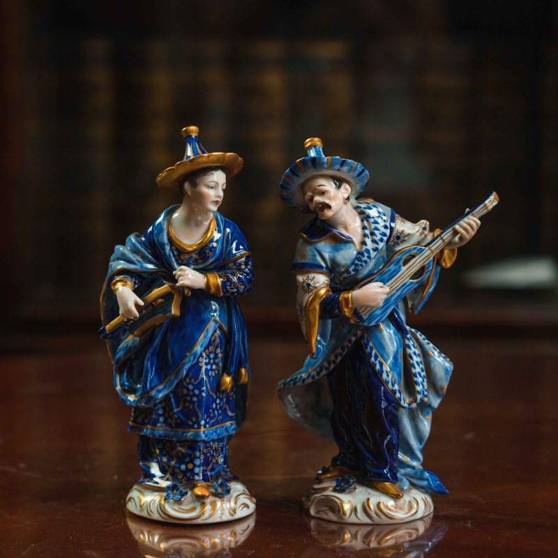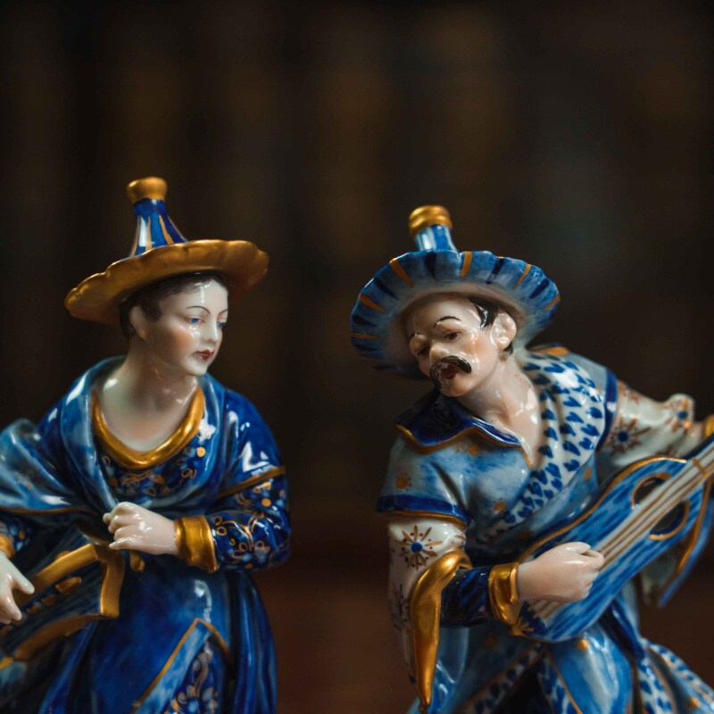 Фигуры изображают малабара и малабарку в традиционных одеждах с музыкальными инструментами. Оба персонажа одеты в богатые восточные костюмы: длинные многослойные одеяния глубокого кобальтового синего цвета украшены сложным растительным орнаментом, прорисованным золотом. Широкополые шляпы с высоким завершением придают композиции характерный «восточный» колорит, соответствующий европейским представлениям о Малабаре (Южная Индия и Восток в целом). Малабар — первая колонизированная европейцами территория Индии. Проживающий на Малабарском берегу народ отличался невероятной музыкальностью. За своей спиной они часто носили клетки с певчими птицами — амадинами и малабарскими жаворонками. Прогуливаясь по улице они радовали всех, кто встречался им на пути.