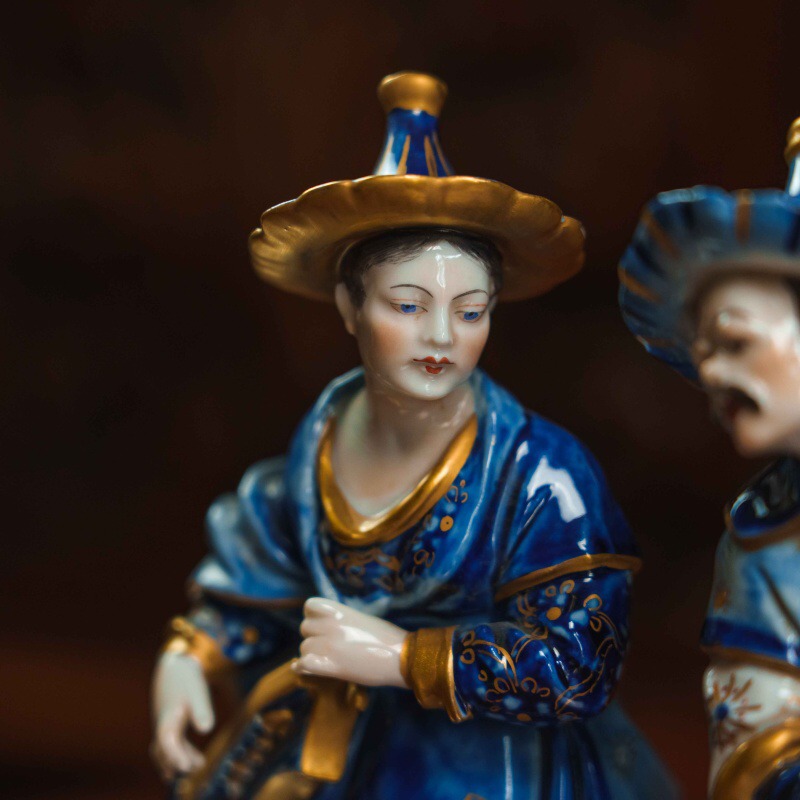 Редкий ансамбль декоративных фарфоровых фигур, созданный на знаменитой тюрингской мануфактуре Aelteste Volkstedt, одной из старейших в Германии, основанной в 1760 году. Композиция представляет собой характерный пример европейской интерпретации экзотических образов Востока, вдохновлённых модой на шинуазри и ориентализм, популярную в XVIII–XIX веках.