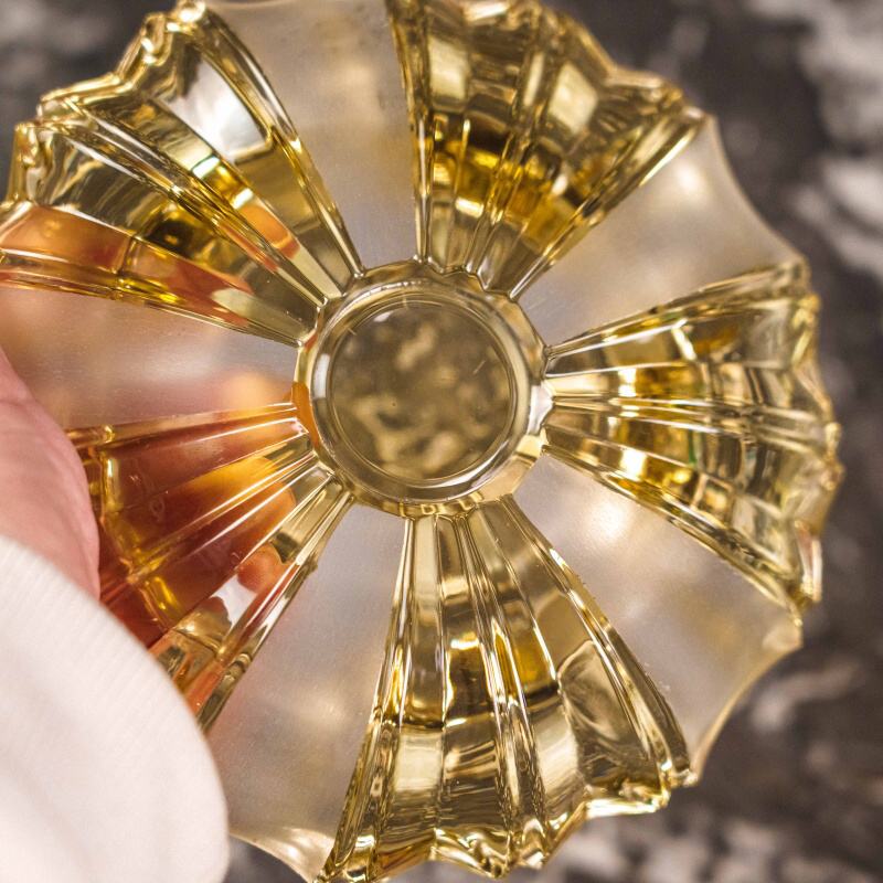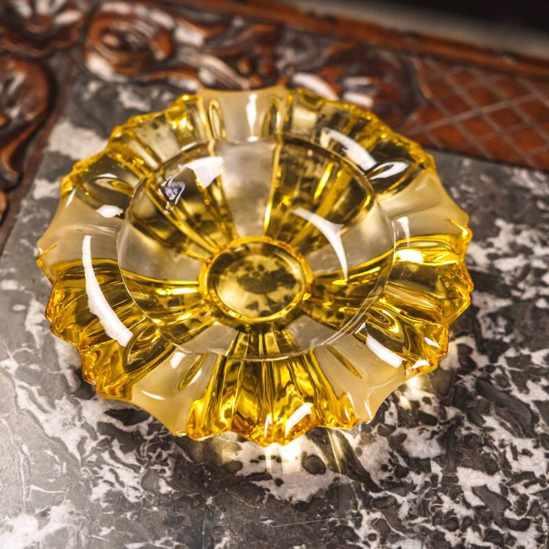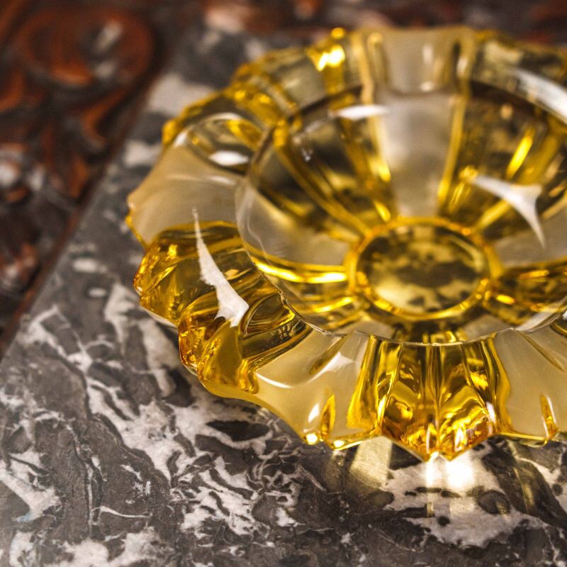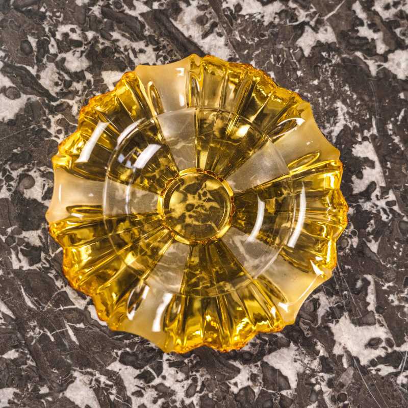 Глубокая радиальная огранка образует выразительные лепестки, красиво преломляющие свет и создающие эффект тёплого золотого сияния. Сочетание матовых и прозрачных участков подчёркивает рельеф и придаёт предмету визуальную глубину.