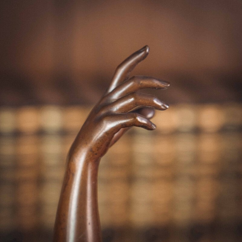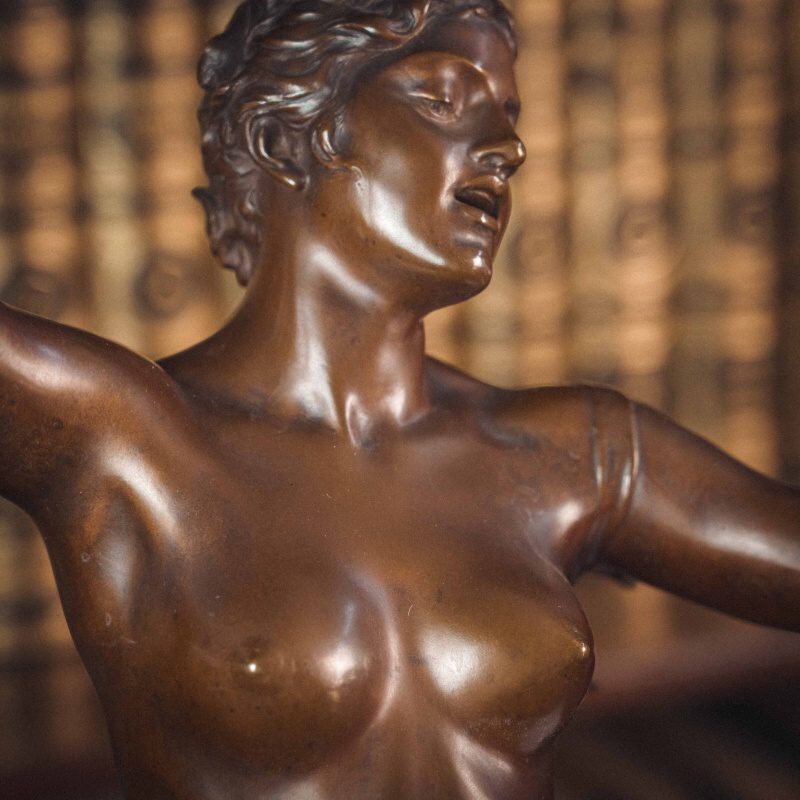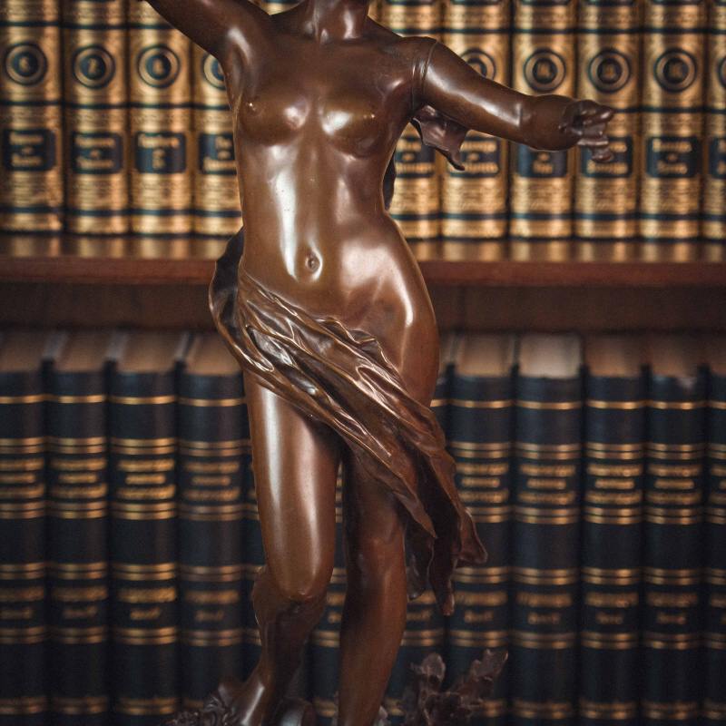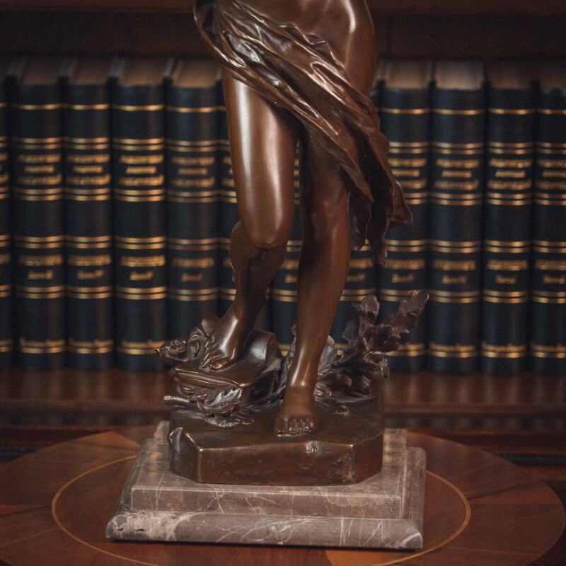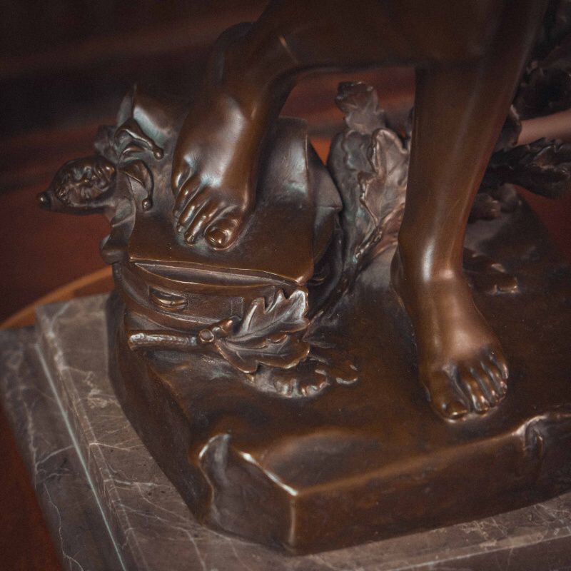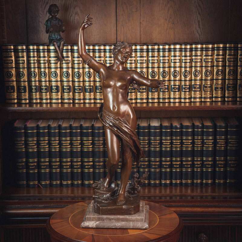 Изящная бронзовая скульптура «Песня молодости». Молодая женщина изображена в лёгком, плавном повороте: одна рука поднята вверх, другая мягко уводит движение в сторону, создавая ощущение ритма и непрерывности жеста. Вся композиция построена на текучести линий и естественности позы. Скульптор словно стремится передать не только внешний образ, но и состояние — лёгкость, свободу, внутреннюю мелодию. Драпировка, едва касающаяся тела подчёркивает линии и создаёт живую игру света на бронзе. Работа французского скульптора Felix Maurice Charpentier отражает художественные поиски своего времени — стремление передать живую эмоцию, пластичность и мимолётность момента.