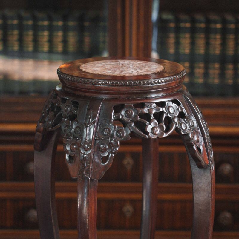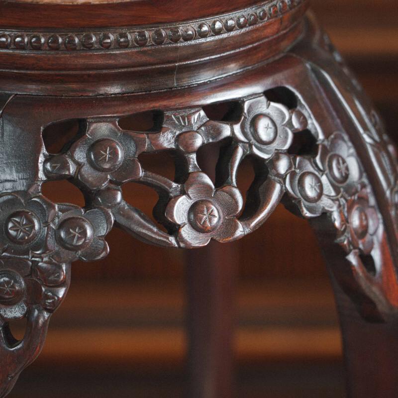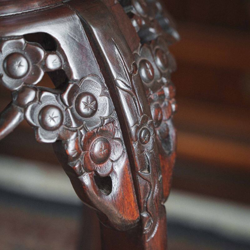 В китайской традиции цветы сливы символизируют долголетие, надежду и стойкость духа. Резьба выполнена очень тонко, ветви плавно переходят в основания ножек, создавая неразрывную визуальную связь.