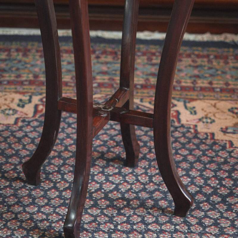 Столешница имеет круглую форму с аккуратным резным бортиком по краю, что характерно для классических подставок под тяжелые бронзовые курильницы или высокие напольные вазы.