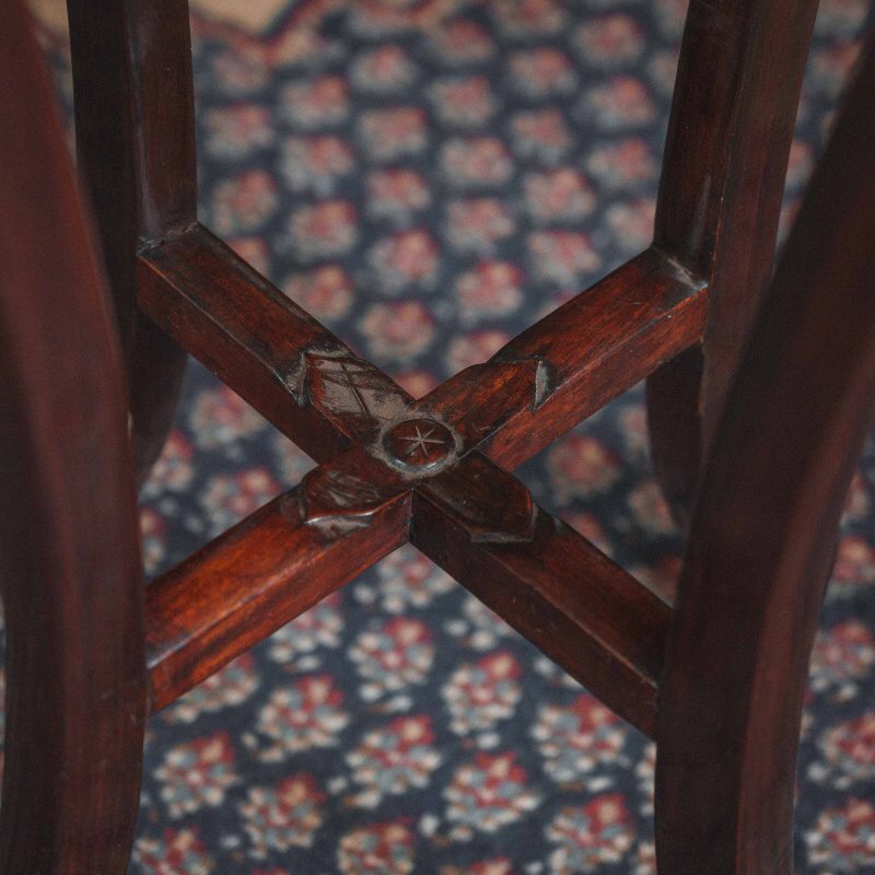 Круглая столешница венчается массивным основанием, которое опирается на четыре необычайно длинные, изогнутые ножки. Предмет выполнен из темного лакированного дерева, обладающего благородным матовым блеском. Темный оттенок дерева идеально подчеркивает глубину резьбы.