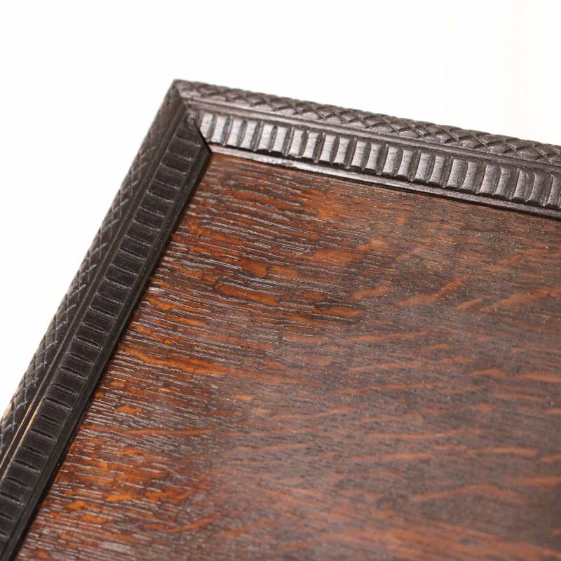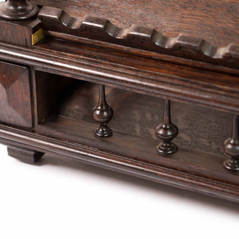 Откидная спинка украшена аккуратной резьбой по верхнему краю, придающей предмету лёгкую декоративность без излишней вычурности. Небольшие точёные навершия по бокам добавляют композиции завершённости и подчёркивают симметрию формы.