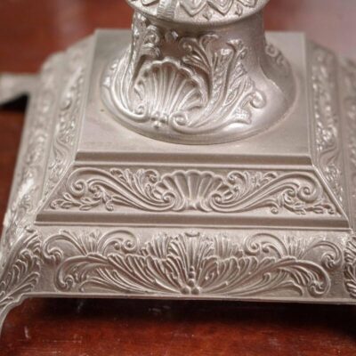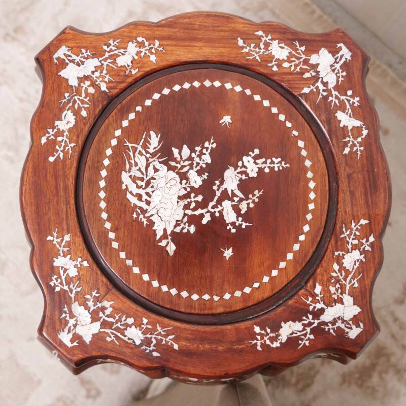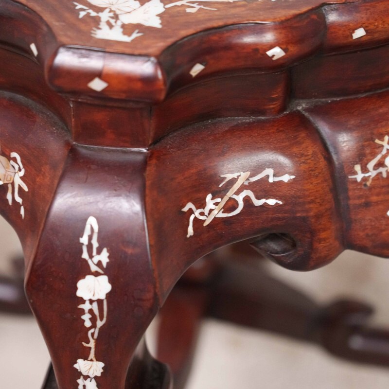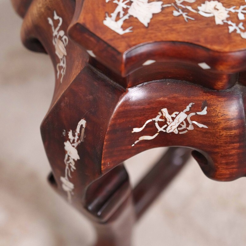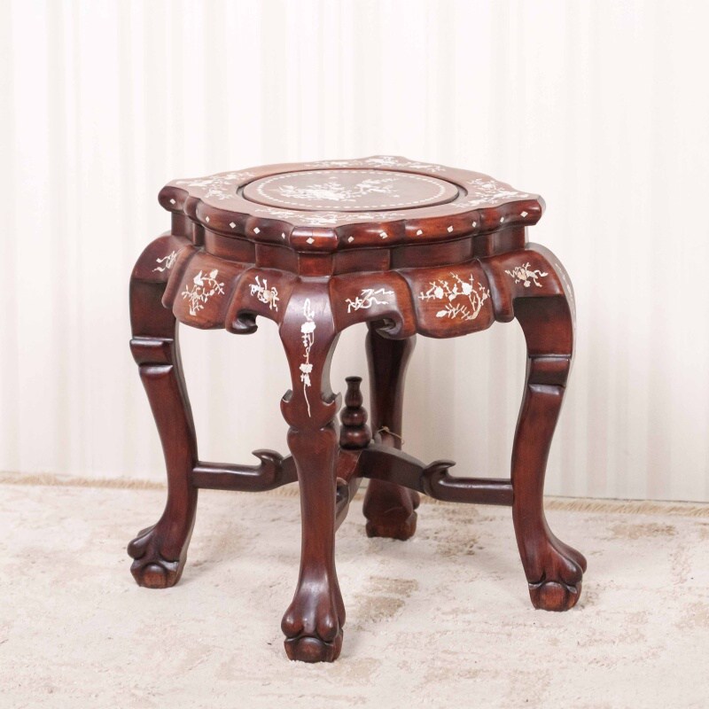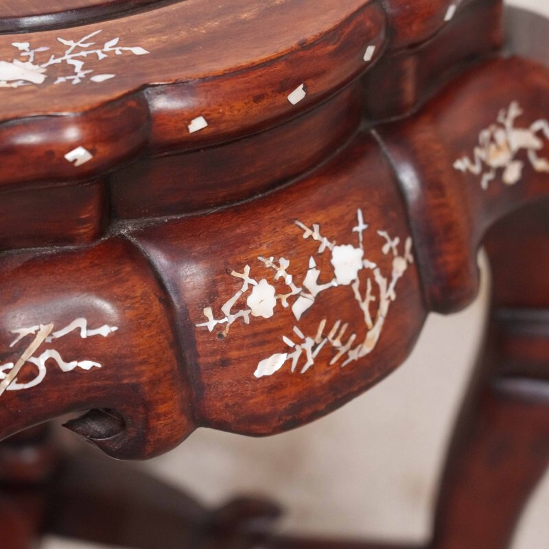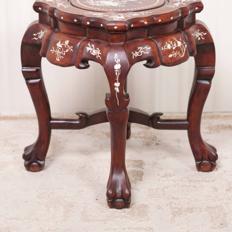 Эта антикварная подставка является выразительным примером стиля Шинуазри — европейского направления, вдохновленного искусством Дальнего Востока, и привносит в интерьер элемент экзотики и утончённой декоративности. Предмет использовался как декоративный пьедестал для ваз, цветочных горшков, статуэток или просто как низкий табурет. Подставка демонстрирует характерное для Шинуазри сочетание европейской формы и азиатских декоративных приемов. Фигурные, изогнутые ножки с характерными «когтистыми» опорами или тонкими линиями придают подставке грацию и устойчивость.