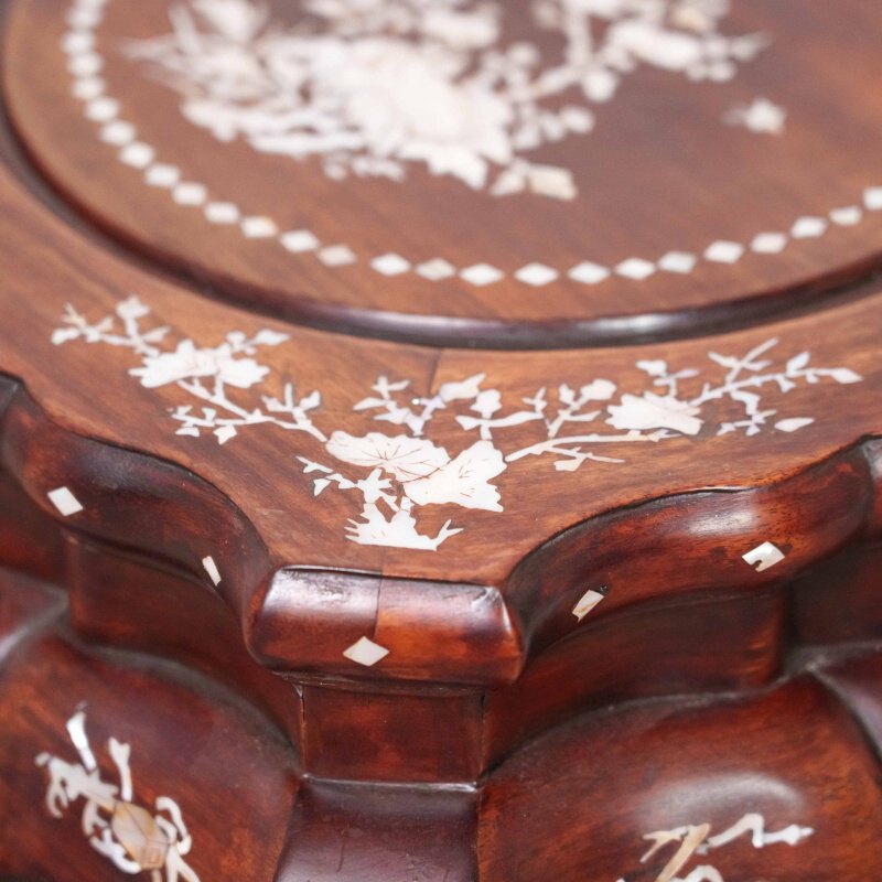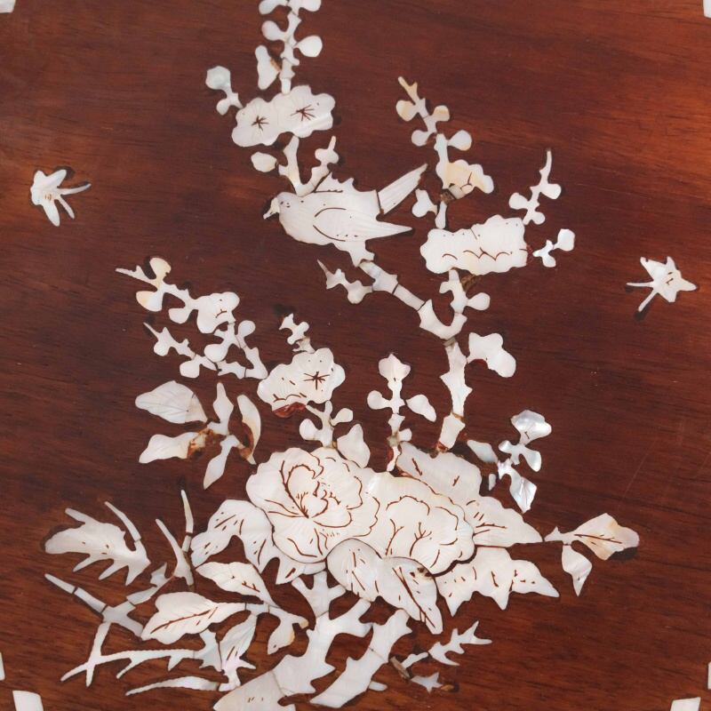 Подставка покрыта ярким многослойным лаком, который является визитной карточкой азиатского искусства. Декор выполнен в виде инкрустации перламутром (накрывом), который создает мерцающий, радужный орнамент на темном фоне, чаще всего в виде цветочных гирлянд, пейзажей или жанровых сцен.