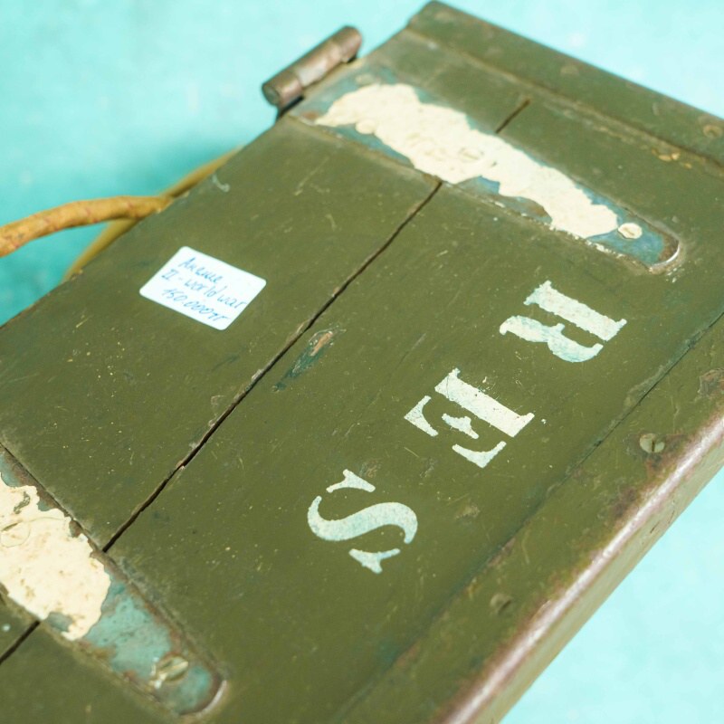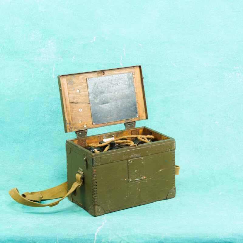 Этот оригинальный полевой телефон времён Второй мировой войны представляет собой подлинный экспонат британского военного снаряжения. Аппарат размещён в прочном деревянном ящике армейского образца, окрашенном в защитный оливковый цвет. С внутренней стороны крышки сохранилась металлическая табличка с инструкциями по эксплуатации — характерная особенность британских средств связи периода войны.