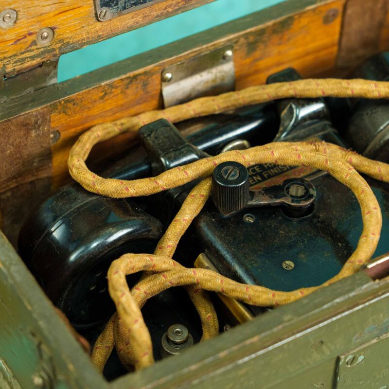 Внутренняя часть содержит телефонный механизм, витой армейский кабель и крепления, полностью соответствующие конструкции того времени. Эти устройства использовались для связи между командными пунктами, наблюдательными точками и линиями обороны. Телефоны подобного типа отличались надёжностью и простотой, что делало их незаменимыми в полевых условиях.