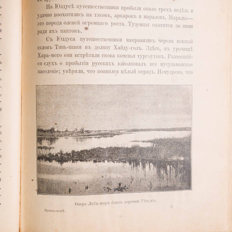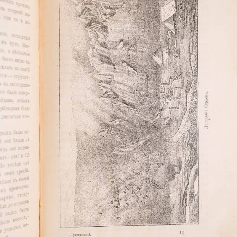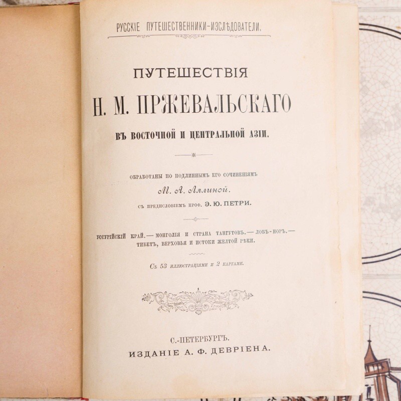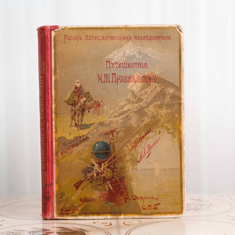 Антикварная книга «Путешествие Н.М. Пржевальского в Восточной и Центральной Азии», изданная в Санкт-Петербурге в 1891 году, издание А.Ф. Девриена. Труд содержит 60 иллюстраций и 2 карты. Текст книги напечатан в кириллице, в дореформенной графике конца XIX в., на русском языке. На титульном листе содержится надпись, что материалы обработаны по подлинным сочинениям Н.М. Пржевальского М.А. Лялиной. Предисловие к книге написано профессором Э.Ю. Петри.