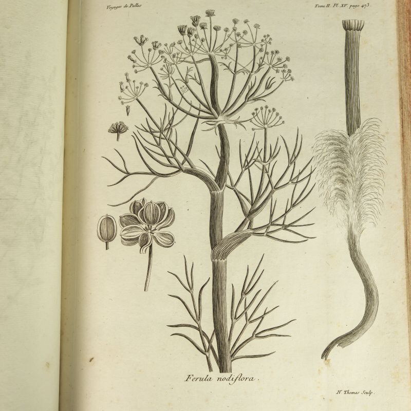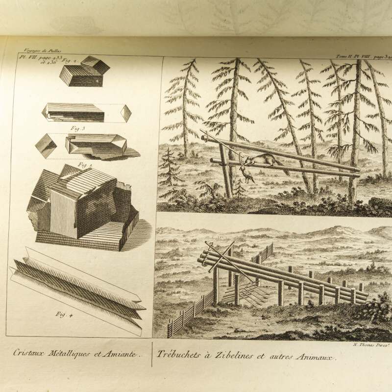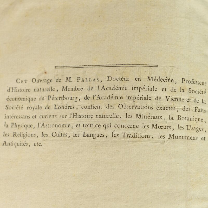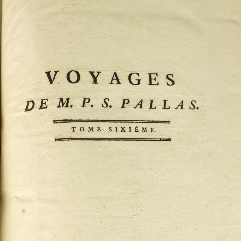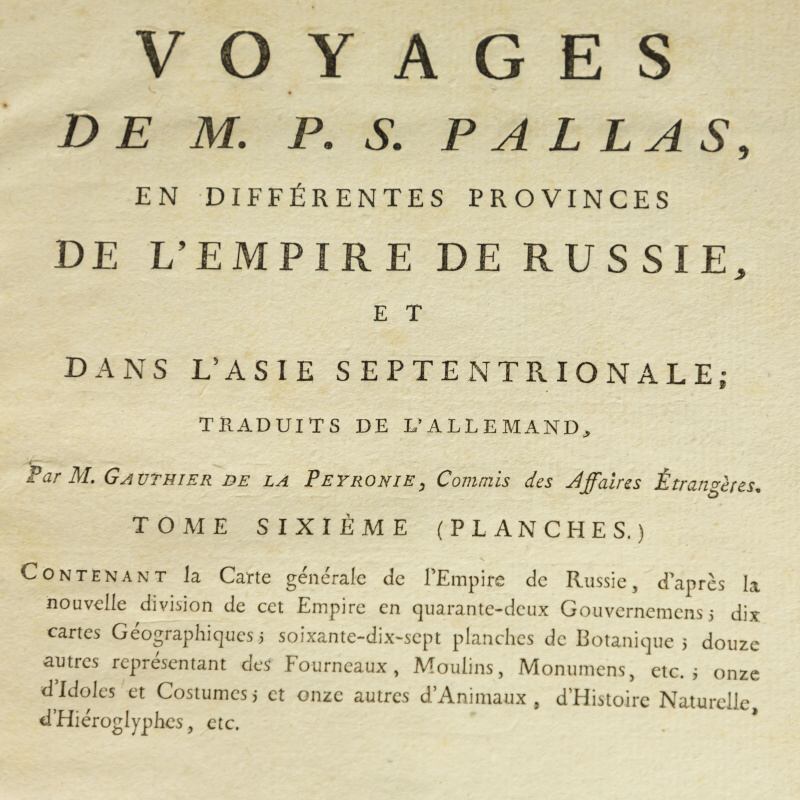 Voyages du professeur Pallas dans plusiers provinces de l’Empire de Russie» («Путешествия профессора Палласа по разным провинциям Российской империи и по Северной Азии») главный научный труд немецкого ученого, который является результатом комплексной экспедиции, организованной Академии наук для исследования России в естественноисторическом, экономическом и культурном отношении. Питер Симон Паллас (1741-1811 гг.) руководил Оренбургской экспедицией и с 1768 по 1774 гг., в течение шести лет отряд Палласа провел выдающиеся исследования европейской части России, Урала и Сибири. Огромный фактический материал собранный Палласом в своем путевом журнале лег на основу данного многотомного труда. Путешествия и исследования Петра Симона Палласа в XVIII веке оказали значительное влияние на изучение территории современного Казахстана, предоставив ценные сведения о его природе, народах и истории.