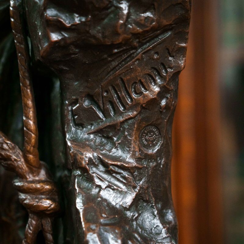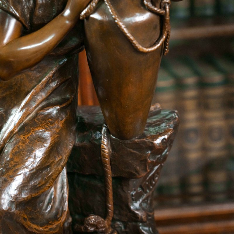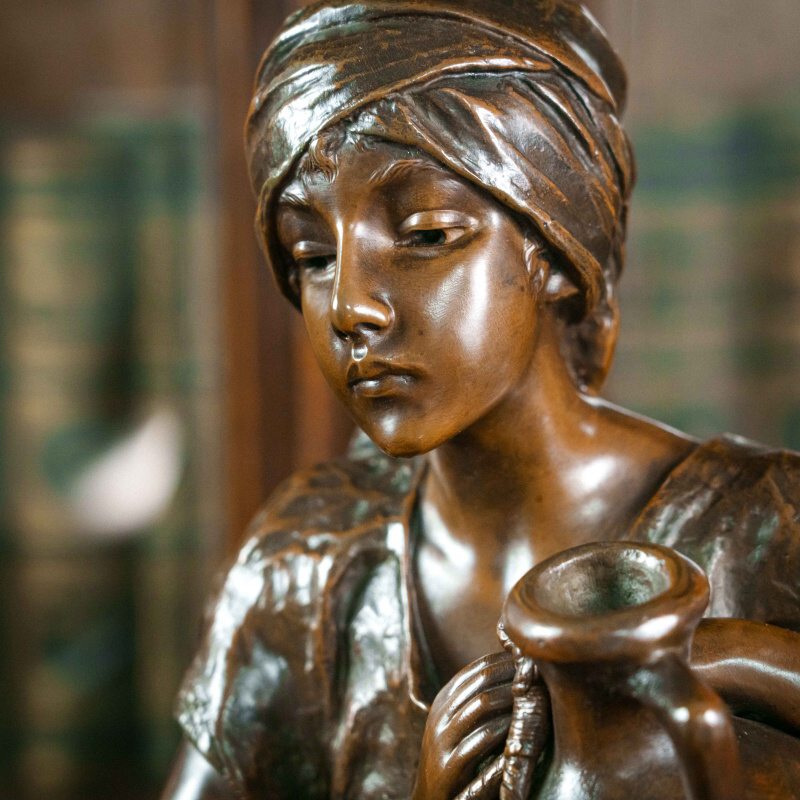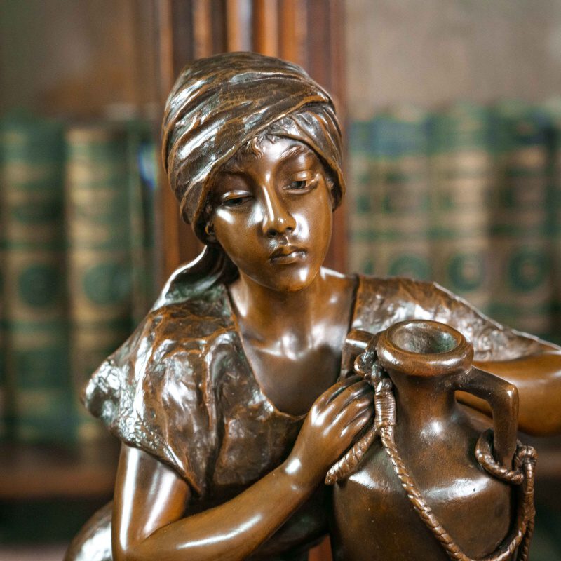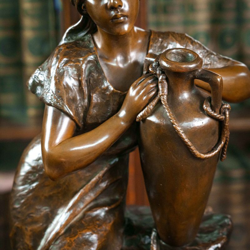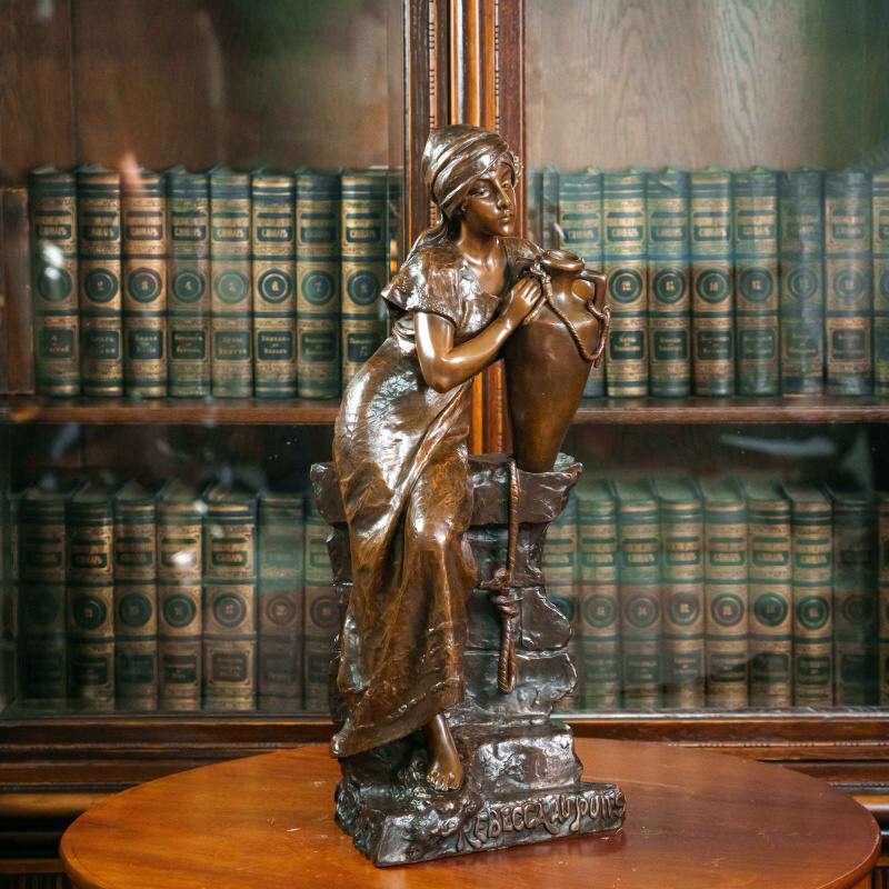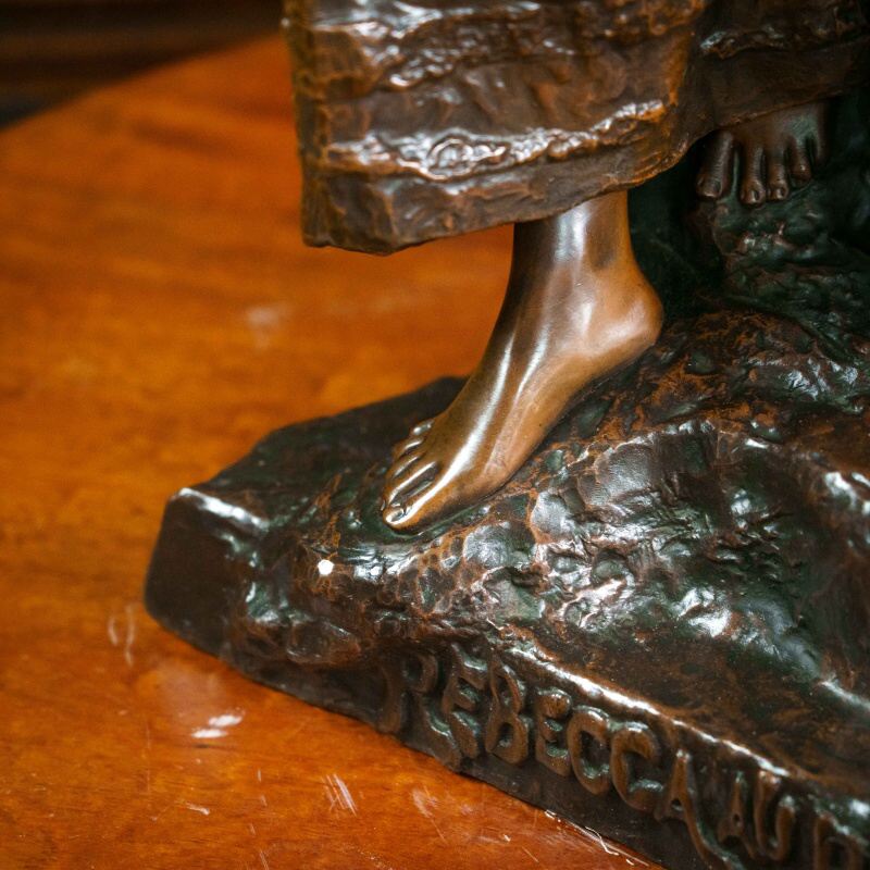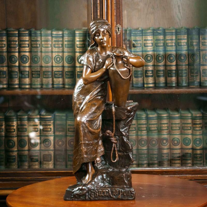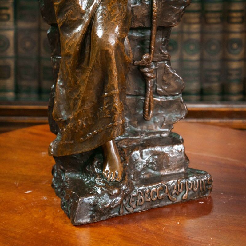Изящная бронзовая скульптура «Ребекка у колодца» представляет собой образ молодой женщины в восточном одеянии, сидящей у каменного колодца с большим кувшином в руках. Композиция вдохновлена сюжетом, где Ревекка, проявив гостеприимство и щедрость у колодца, предстаёт символом скромности, чистоты и добродетели. Villanis мастерски передал гармонию пластики: плавные линии фигуры, задумчивый поворот головы и мягкое выражение лица сочетаются с детально проработанной фактурой одежды, сосуда и камня. Использованная тёплая бронзовая патина усиливает впечатление живости и внутренней поэзии образа. На композиции имеется подпись автора — E. Villanis.