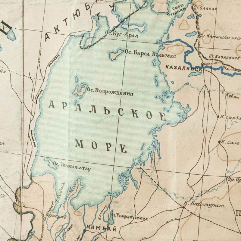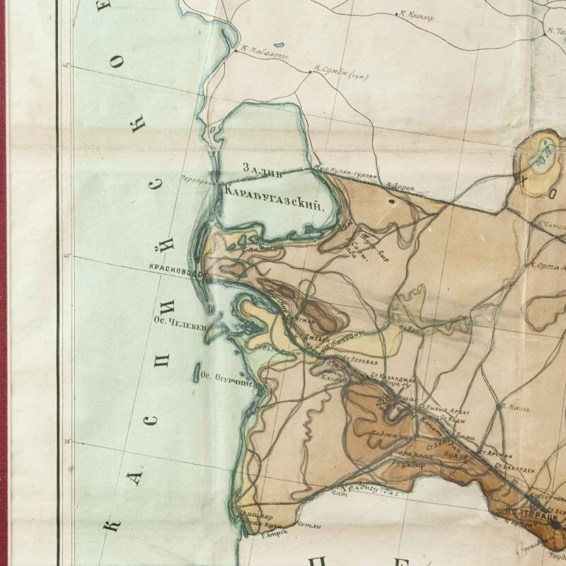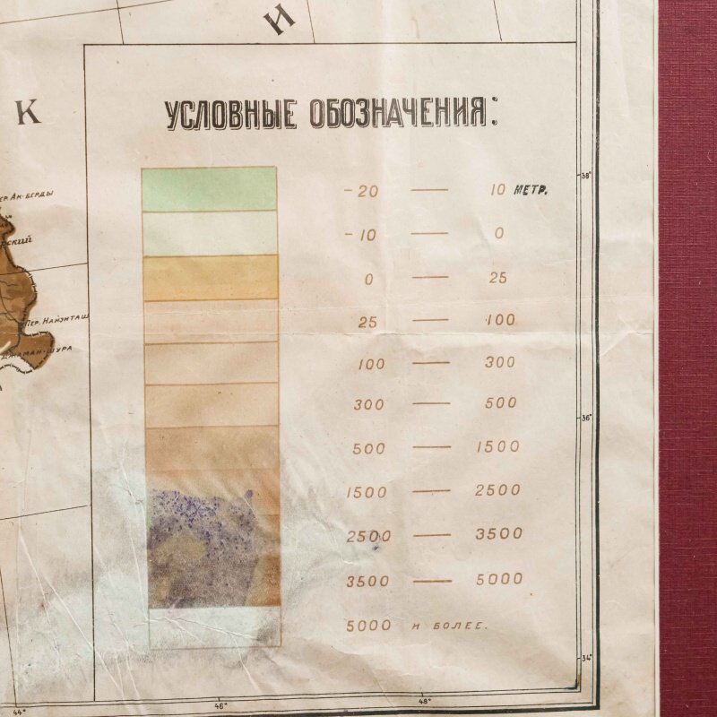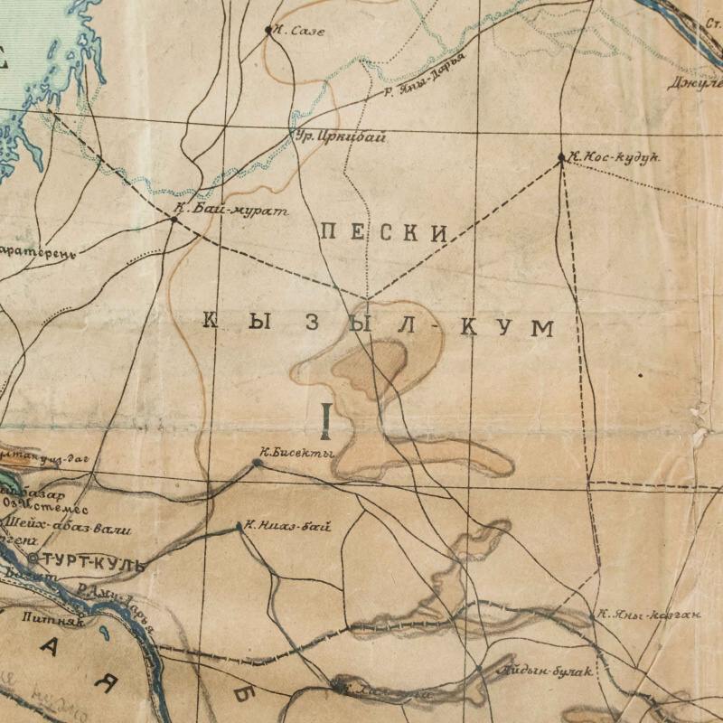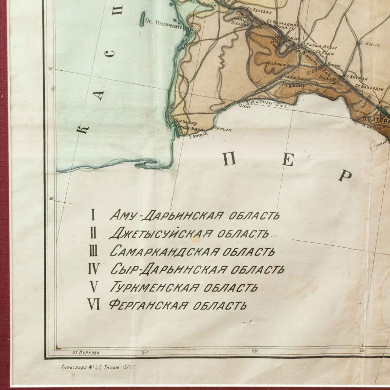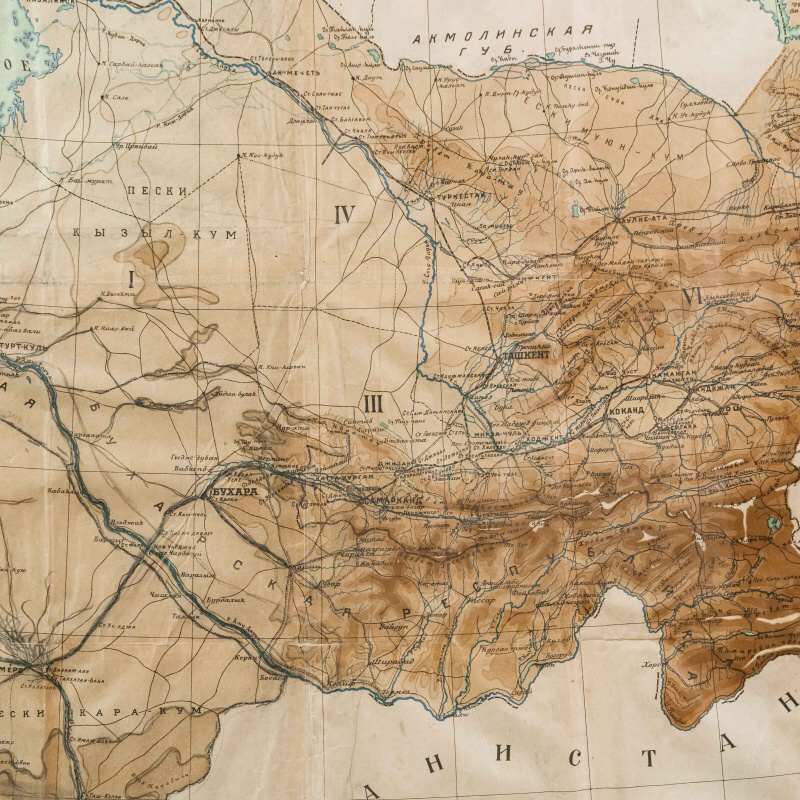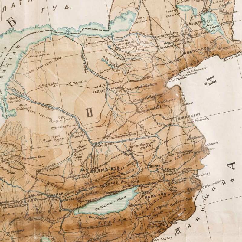 Гипсометри-ческая и физико-географическая карта Среднеазиатских республик, составленная под редакцией подпоручика Александра Фёдоровича Ледомского (Тарасова) и профессора Николая Александровича Димо. Карта основана на топографических съемках Военно-топографического отдела Т.В.Т.О., представляя собой уникальное сочетание научной точности и наглядной географической выразительности. Карта охватывает обширную территорию Средней Азии, включая границы бывших Туркестанских областей, части Казахской степи, а также современные республики: Казахстан, Узбекистан, Туркменистан, Таджикистан и Киргизия. Карта выполнена с применением гипсометрической шкалы окраски, позволяющей определить высотный рельеф местности: от пониженных пустынных равнин (Кызылкум, Каракум) до горных хребтов Тянь-Шаня и Памира. Отмечены важнейшие реки (Аму-Дарья, Сыр-Дарья, Зеравшан, Или, Кара-тал, Чу), орошаемые земли, солончаки, песчаные массивы и озёра. Детально отмечены ключевые административные области: Амударьинская (I), Джетысуйская (II), Самаркандская (III), Сырдарьинская (IV), Туркменская (V) и Ферганская (VI). Особое внимание уделено политико-административному делению, обозначены границы республик, автономных областей и уездов на момент составления карты. Также карта включает разветвлённую транспортную сеть того времени — железные и гужевые дороги, караванные пути, важнейшие форты и военные гарнизоны. Названия населённых пунктов даны с учетом исторической и административной принадлежности, включая дореволюционные и советские топонимы. Рельеф представлен в виде цветовой шкалы высот (в метрах), со штриховыми изолиниями или градиентом оттенков. Использованы государственные десятиверстные карты Генерального штаба, геологические и топографические данные.