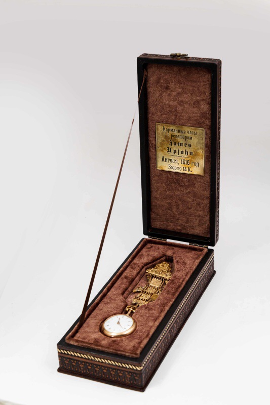 Массивный корпус из золота 18 карат (750 проба). Вес корпуса — 39 грамм. Изготовлен по индивидуальному заказу в Лондоне в 1816 году мастером «CM» специально под этот механизм. Ажурная прорезка корпуса выполнена для идеального звучания репетира, Часы представлены в виде завершенного антикварного подарка, что выделяет его на фоне обычных коллекционных предметов: Часы и шатлен размещены в специальном коробе с бархатным ложементом. Футляр подчеркивает историческую значимость предмета и обеспечивает его безопасное хранение. На внутренней крышке футляра закреплена табличка с описанием (Мастер, Год, Материал), что придает подарку статусность официального исторического артефакта. Подарок такого уровня символизирует преемственность поколений, уважение к истории и безупречный вкус. Это предмет, который невозможно купить в обычном магазине — он существует в единственном экземпляре. Идеальный выбор для подарка первого лица, государственного деятеля или крупного бизнесмена. Он сочетает в себе блеск драгоценного металла и инженерный гений эпохи Просвещения.