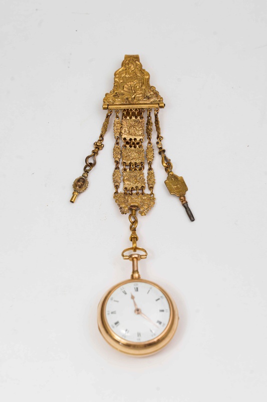 Материал Часы с функцией четвертного репетира (Quarter Repeater) на шатлене. Массивный корпус из золота 18 карат (750 проба) -1816 года. Эксклюзивный футляр: Часы и шатлен в коробе с бархатным ложементом.